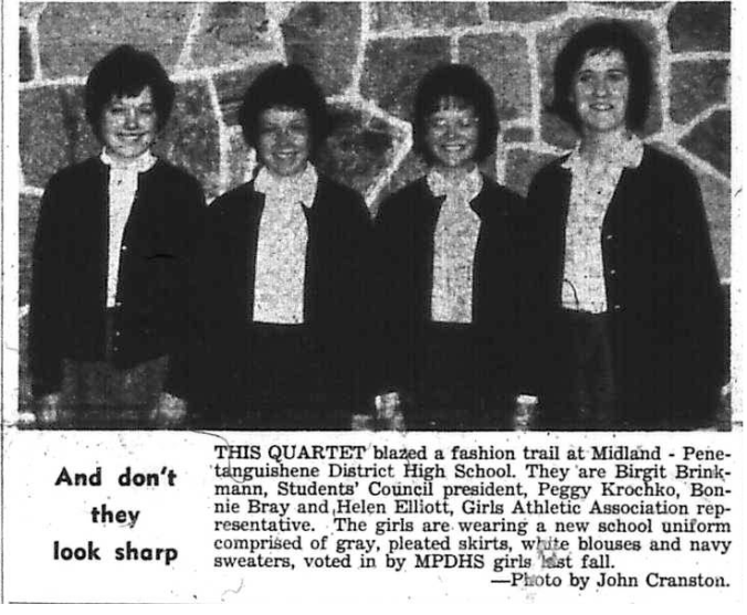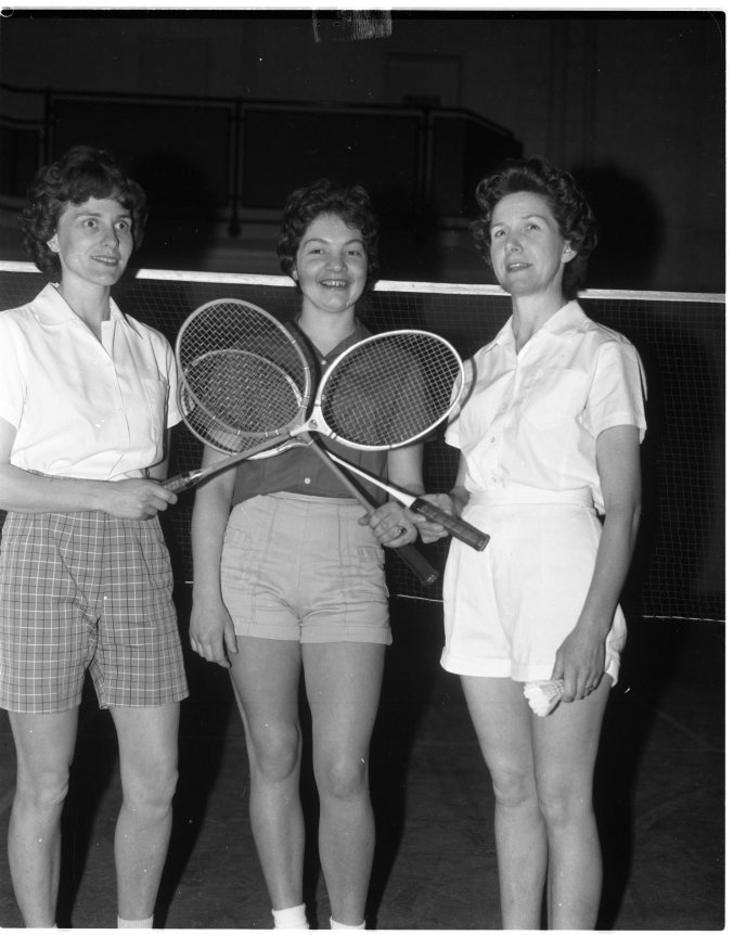 These three gals shouldn’t have any trouble finding “someone for badminton”. Members of the Midland Garrison Badminton Club, they will be taking part in the Georgian Bay district tournament here at the end of the month. Left to right are Anita Cote, Jean DeVillers and Dorothy Wood. [Dorothy Wood, nee Ladoucer, died in March, 96 years young. I saw her often in the downtown, always smiling and friendly.]