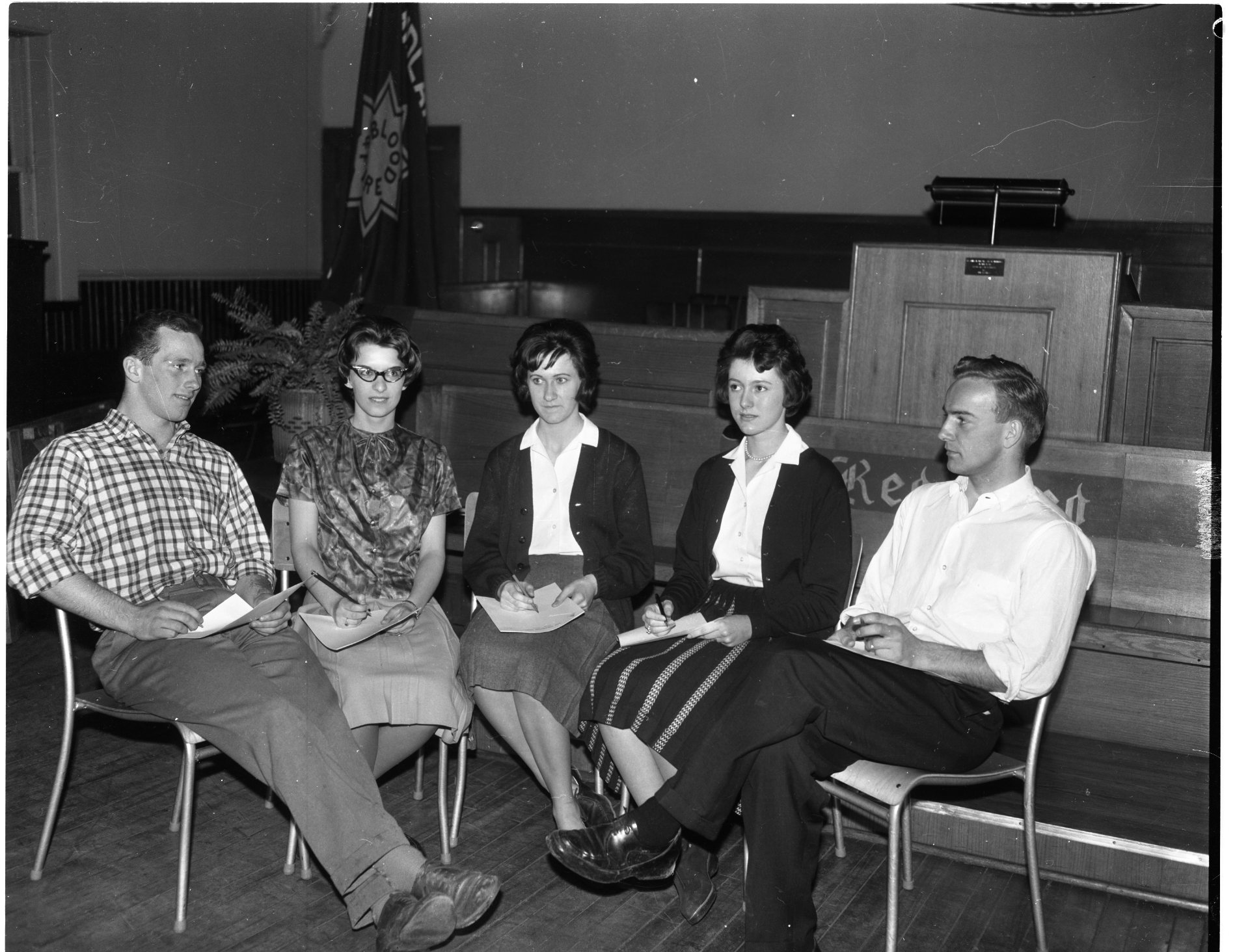 Five of the six Midland-Penetanguishene District High School students, who will participate in a panel discussion at Midland Salvation Army Corps Saturday night, are pictured above. The students and Army officer cadets will hold a “Frank Talk on Religion”. Pictured are Jim McKinnon, Joan Gropp, Helen Elliott, Bonnie Brisbois and Arthur Crawford.