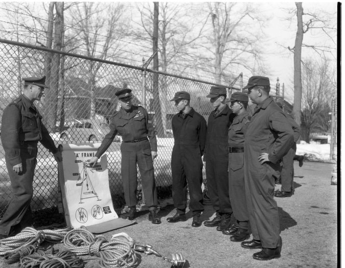 Members of the survival course are given instructions by chart on how to construct an “A” frame for lifting and lugging heavy objects. Left to right are; Major L. H. Taylor, Midland, Sgt. J. E. Clegg, Toronto, and Troopers W. A. Evans, Port McNicoll, A. M. Casacagnette, Penetang, Larry Magolski, Barrie, and D. E. Veysey, Elmvale.