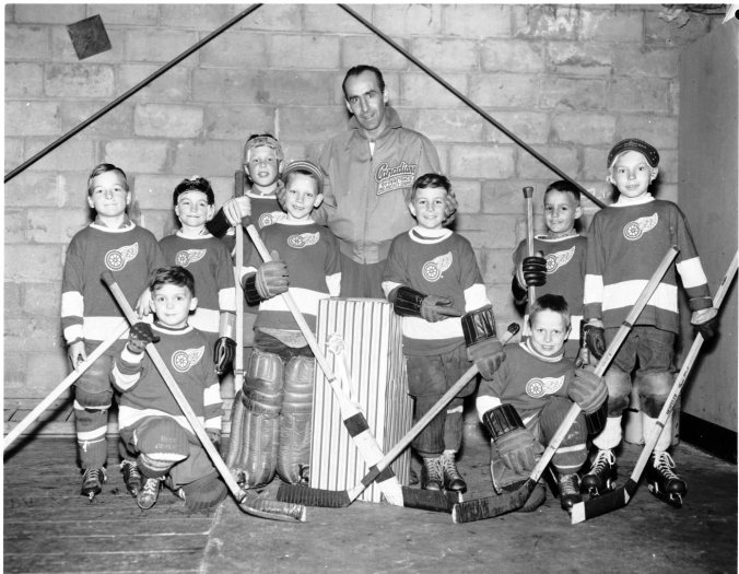It took this group of tads 25 minutes of overtime play to win the junior “B” championship of Penetang’s Little NHL, Thursday night. Following the victory they presented their coach with a gift in appreciation of his work for the season. [The list of players in the newspaper caption had a couple of errors; this is the corrected list with thanks to  Waxy Gregoire.] Standing, John Zwicker, Paul Latour, Adrian Gauthier, Robert Mayer, Gerry Beauchamp (Coach), Brian Hook, Brent Labatt, Jerry Lacroix. Kneeling, Danny Adams, Richard Lefaive.