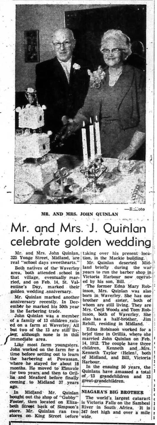 Back in 1880 a young English couple chose March 17 for their wedding day. This Saturday, St. Patrick’s Day, will be their 72nd wedding anniversary for that couple, Mr. & Mrs. Benn Ball. The couple have lived with their daughter, Mrs. Annie Mohan for some years now, but until both were well into their 80’s they lived in a white cottage at Midland Point, just east of Sunburne Lodge. Mrs. Ball, now 91, has reasonably good health but goes out seldom. Her husband at 92, has less wrinkles than many men half that age, except for a short hospital stay for leg trouble a few years ago, and a slight hearing impairment, he has enjoyed remarkable health. Mr. Ball was born in Rotherham, England, July 26, 1870. His wife came from a family of distant relatives at Derby. She was Harriet Mary Ball, born January 9, 1871. Following his apprenticeship in England as a cold steel roller, they came to Midland in 1908, where Mrs. Ball had a brother. Mr. Ball’s employment included construction work on the Tiffin Elevator, with the old firm of Cook and Bath. He also worked as a bricklayer and a boatswain for the late James Playfair and his brother Stewart. One of the boats on which he worked was the Pathfinder, used by the Royal Canadian Navy in World War 11, and another large yacht, the Venetia. His last employment was as a night watchman at the Simcoe Elevator. He retired in 1946. Their son Fred lives at Midland Point, and a daughter, Annie, on Ottawa Street.