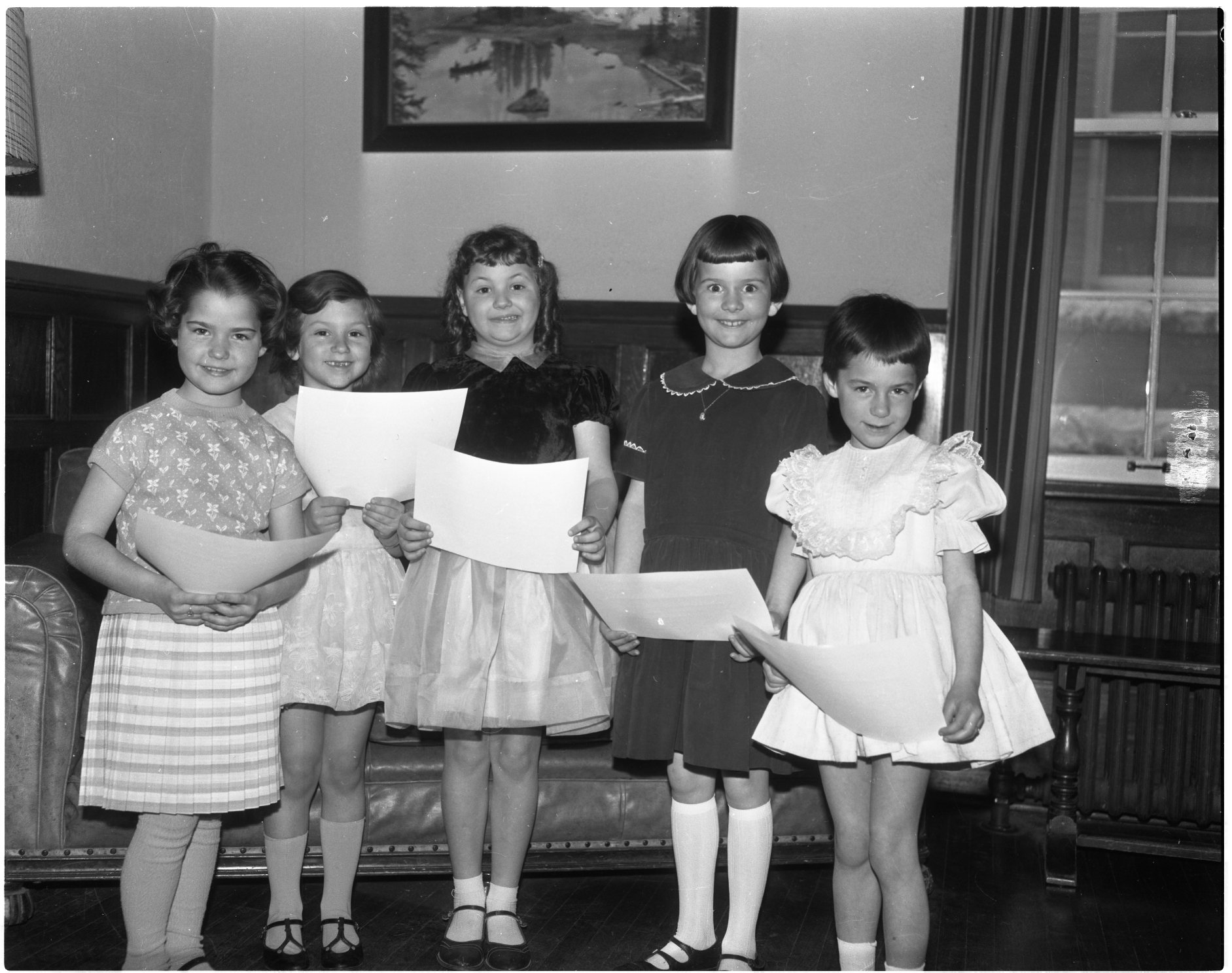 These proud youngsters were the winners in the singing class for Grade 1 girls at the Midland Music Festival last week. Left to right; with their marks, are Ruth Strohm 82, Ruth Shushan 83, Helen Rutherford 84, Marilyn Widdes 82, and Doris Lynn MacMillan 82.