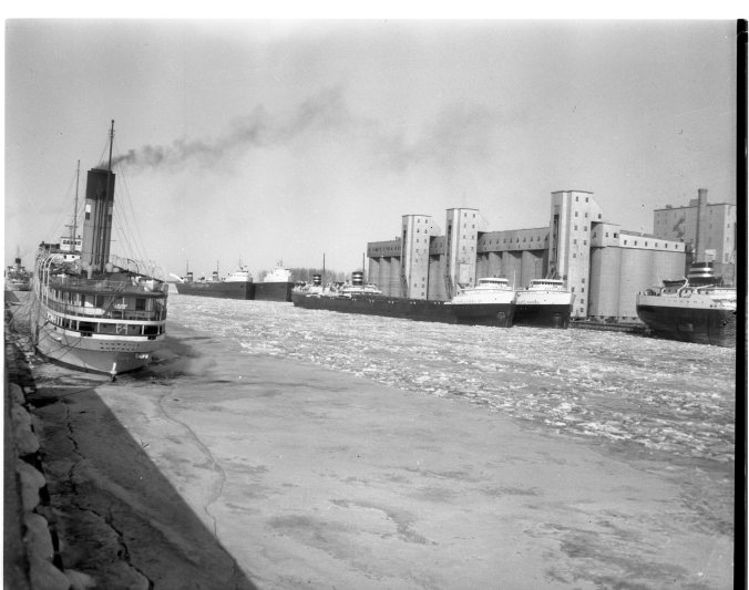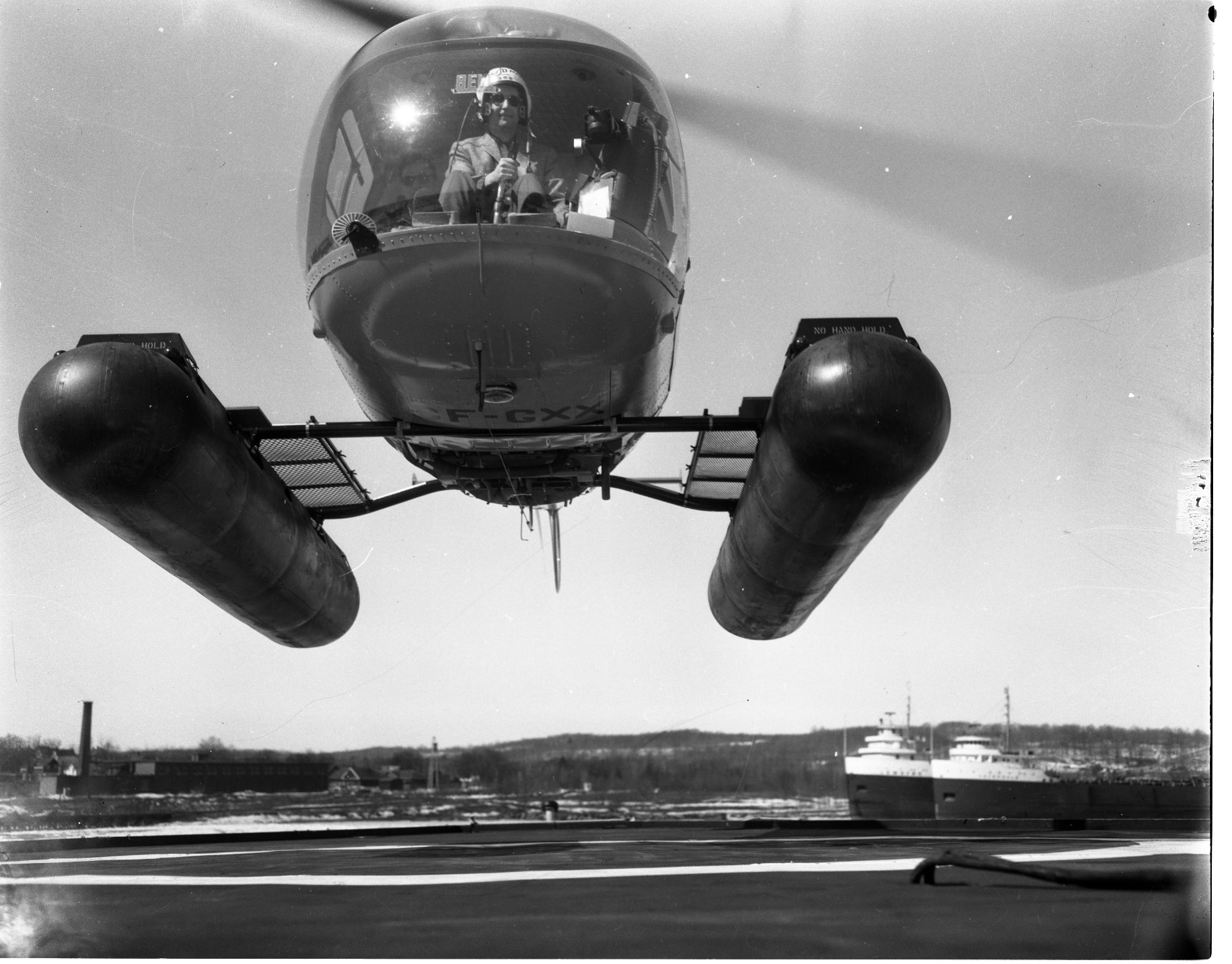 Returning safely to the deck of Alexander Henry after taking lighthouse keeper Alex Herron of Midland to Hope Island Monday morning is this Bell helicopter with Bob Jones of Ottawa at the controls. The return trip took 40 minutes. Mr. Herron is the first keeper this year to reach his lonely vigil via this method of transportation. Sam Sirna of Ottawa is the engineer of the two man copter crew.Smoke from the stack of the CPR passenger ship Keewatin in Port McNicoll harbour heralds the opening soon of another season on the lakes. The other CPR ship Assiniboia, can be seen ahead of the Keewatin, while across the harbour are five of the largest grain carriers on the lakes.