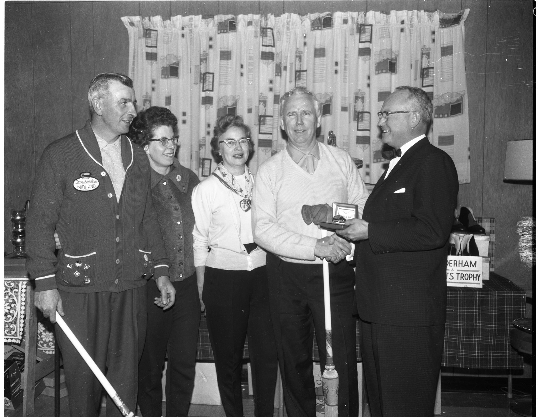 Four Midlander’s are sporting brand new wrist watches these days, their reward for winning the main event in Midland Curling Club’s 13th annual mixed bonspiel this week. Donor of the Orr Trophy, emblematic of the spiel championship, William Orr (right) is seen presenting the watches to, left to right, Stan Burton, Mrs. Burton, Mrs. Bertrand and Karl Bertrand, who skipped the winning entry.
