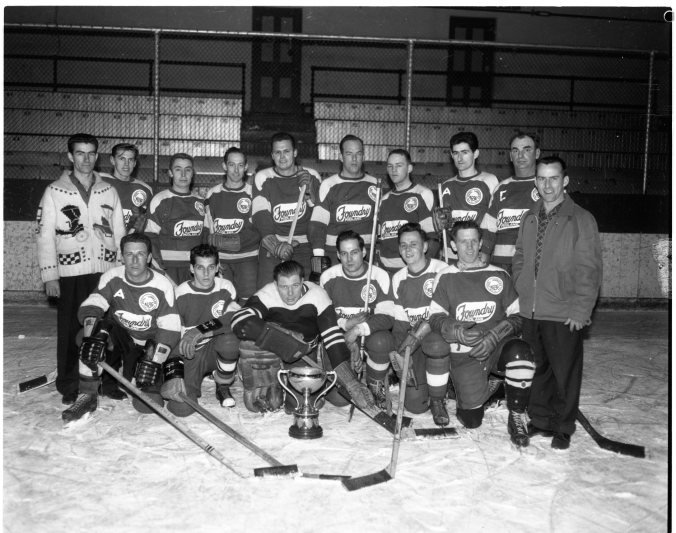 Repeat winners of Midland Recreational Hockey League this season was the Midland Foundry team, seen here. Tied for first place at the end of the regular season schedule, they won their semi-final series with Hebner’s and then took the best-of-three final set from the Pillsbury team.