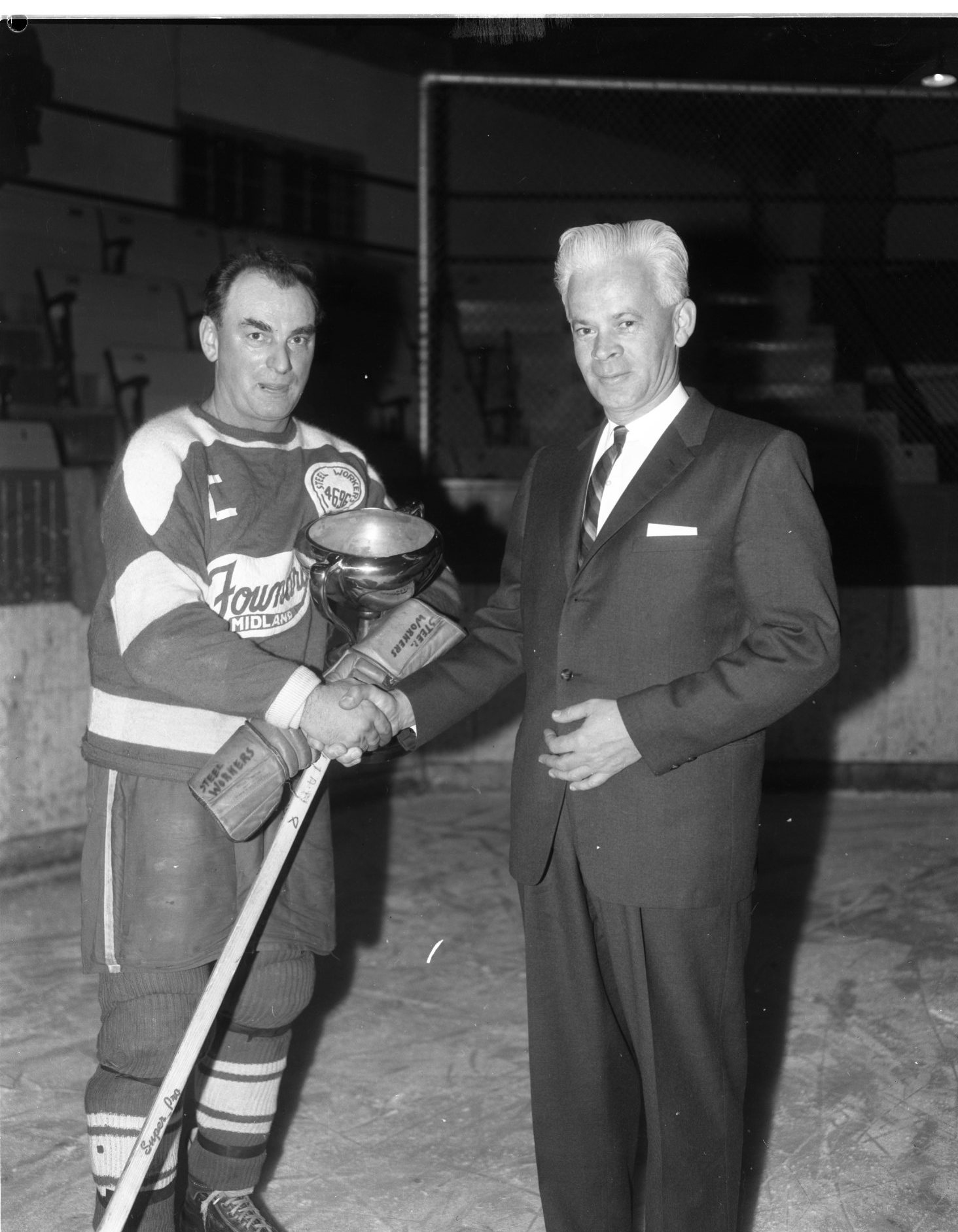 Captain of the Midland Foundry team which won the Recreational Hockey League title Saturday night, Russell Quinn receives the congratulations of the president of the firm, Ken G. Williams. It was the second successive title for the Foundry team.