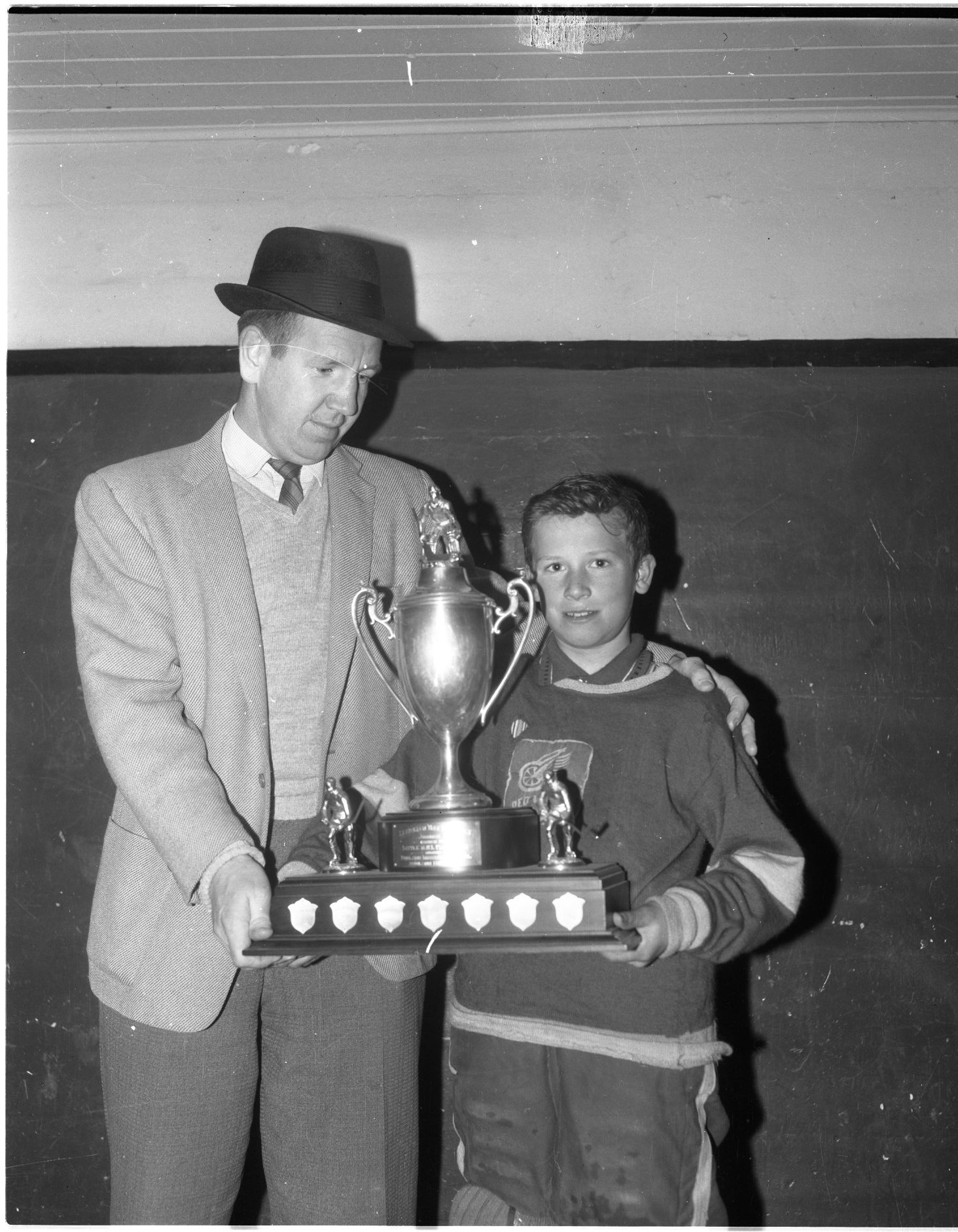 Two Stalwarts – Two good reasons for the success of Midland’s bantam team this year are captain Bob Clayton (left) and coach Garnet Armstrong. They are seen with the trophy the team won Saturday in the Georgian Bay Little NHL finals. Saturday night they met Leamington at Arena Gardens in the first game of the OMHA bantam “A” minor finals.