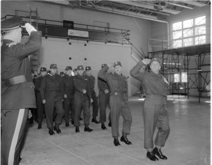 Wednesday was graduation day for the 100 members of the first National Survival Course held at Midland Armory during the past six weeks. In bottom picture, left to right, are Col. John Symons, OC, Grey and Simcoe Regiment, Major L. H. Taylor, and Capt. Dennis Stilwell, RCR. Col. Symons is seen taking the salute at the march-past which preceded a demonstration of skills learned by the men during the intensive training course.