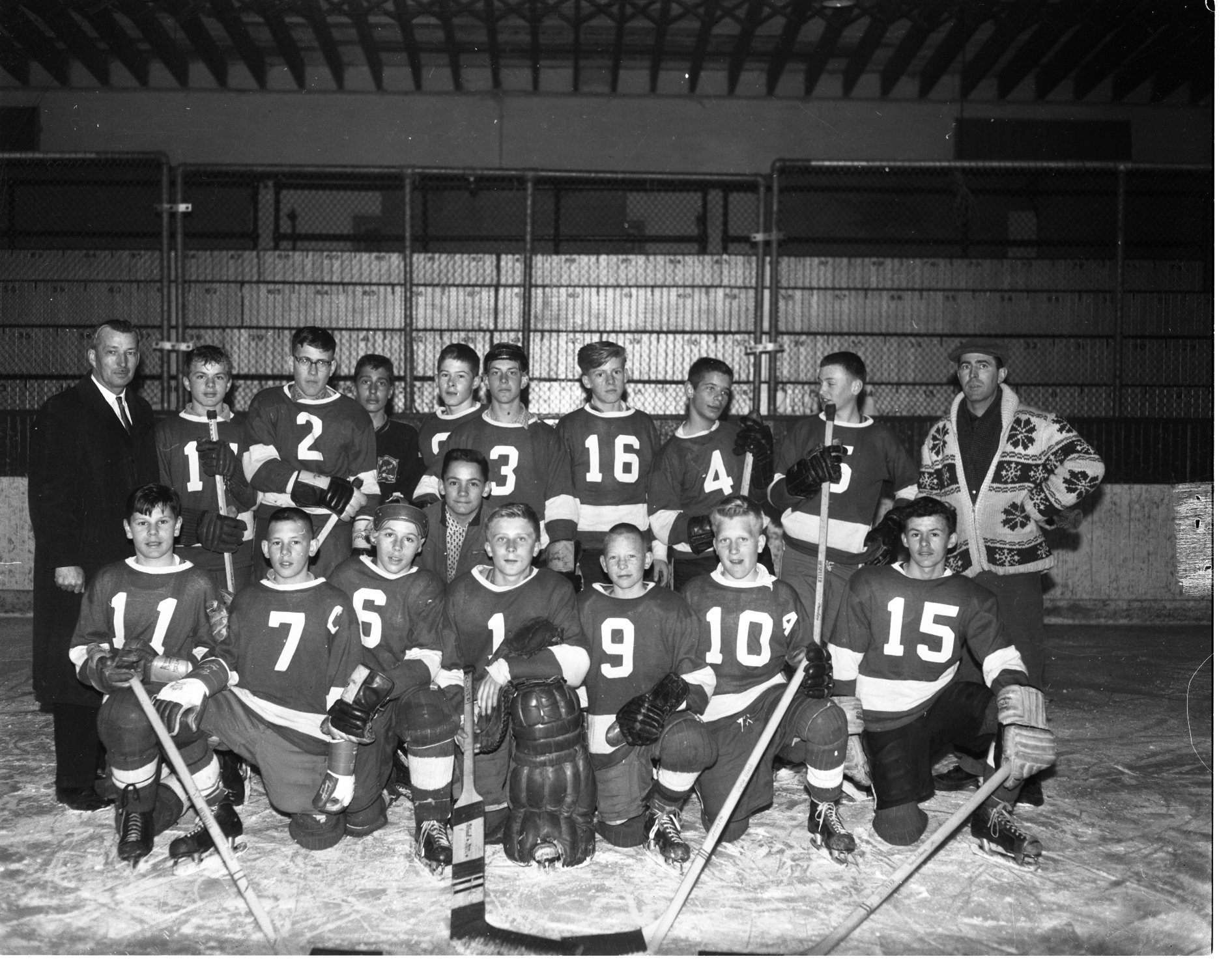 UPDATE – Previous photo from March 28 1962 that included names. Midland Bantams are seen above, following their 5-2 win over Cobourg in the playoff game at Arena Gardens Monday night. They meet Burlington here Friday night in the first game of the semi-finals. Left to right are, front row—Mike Dion, Keith Bath, Fred Cousineau, Brian Merkley (set back no uniform), Ken Blackmon, Earl Scott, Mike Borsa, Rickey Leaney; back row—Rev. Len Self, manager, Pete Stuckey, Vincent Ellery, Art McComb, Bob Clayton, Bob Larmand, Neil Cote, Mike Robitaille, Doug French and coach Garnet Armstrong.
