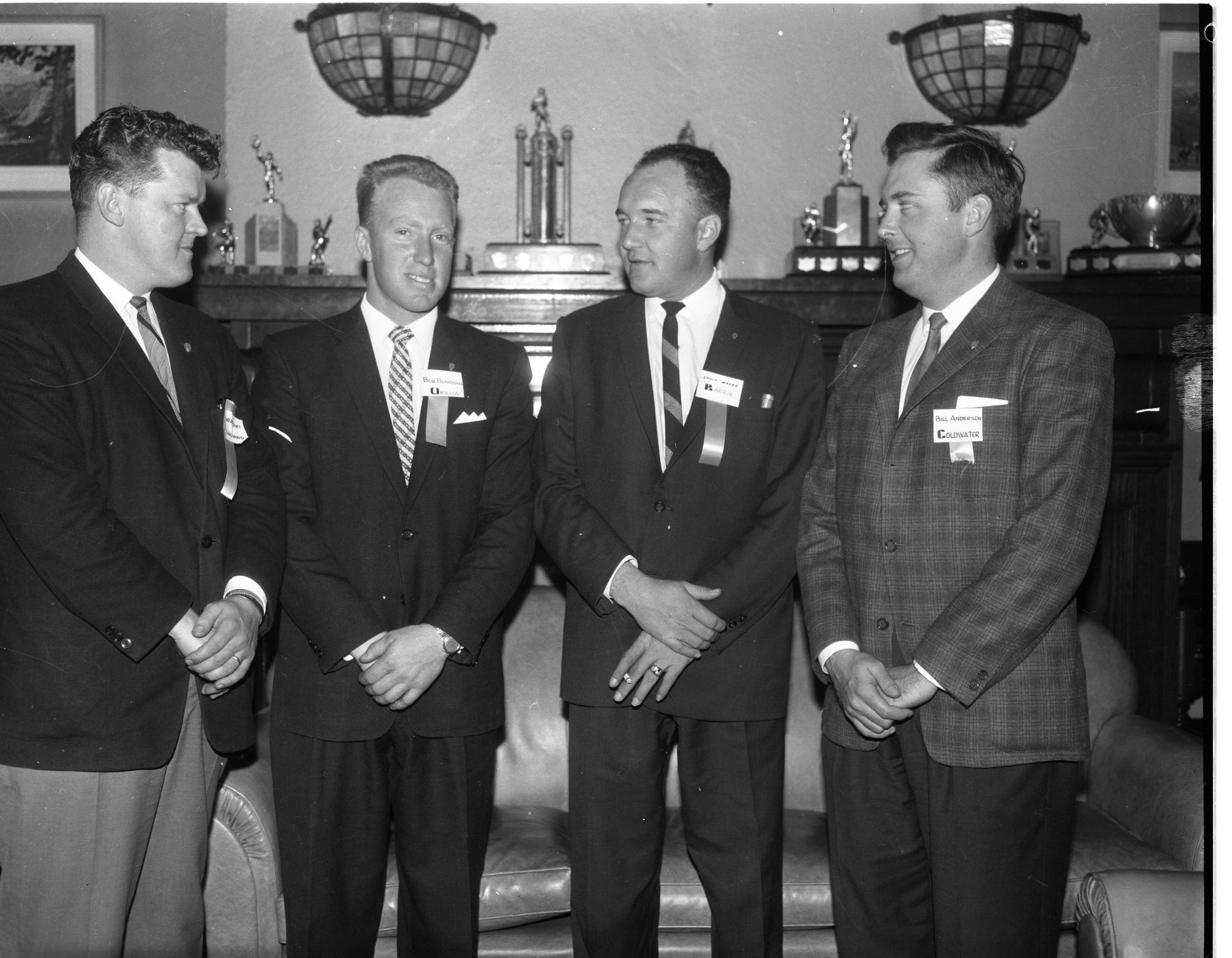 “Spring conference” of District 11 Jaycees drew 60 delegates to Midland’s Georgian Hotel on the weekend. In upper picture, left to right, are Jim Rigley, Collingwood, district president, John Bourgeois, Midland, Al Bowry, Huntsville, Yvon Gagne, Penetang. In lower picture are Delmer Burt, Collingwood, Bob Beardsall, Orillia, “Chuck” Wadge, Barrie, and Bill Anderson, Coldwater. All are presidents of their local clubs.