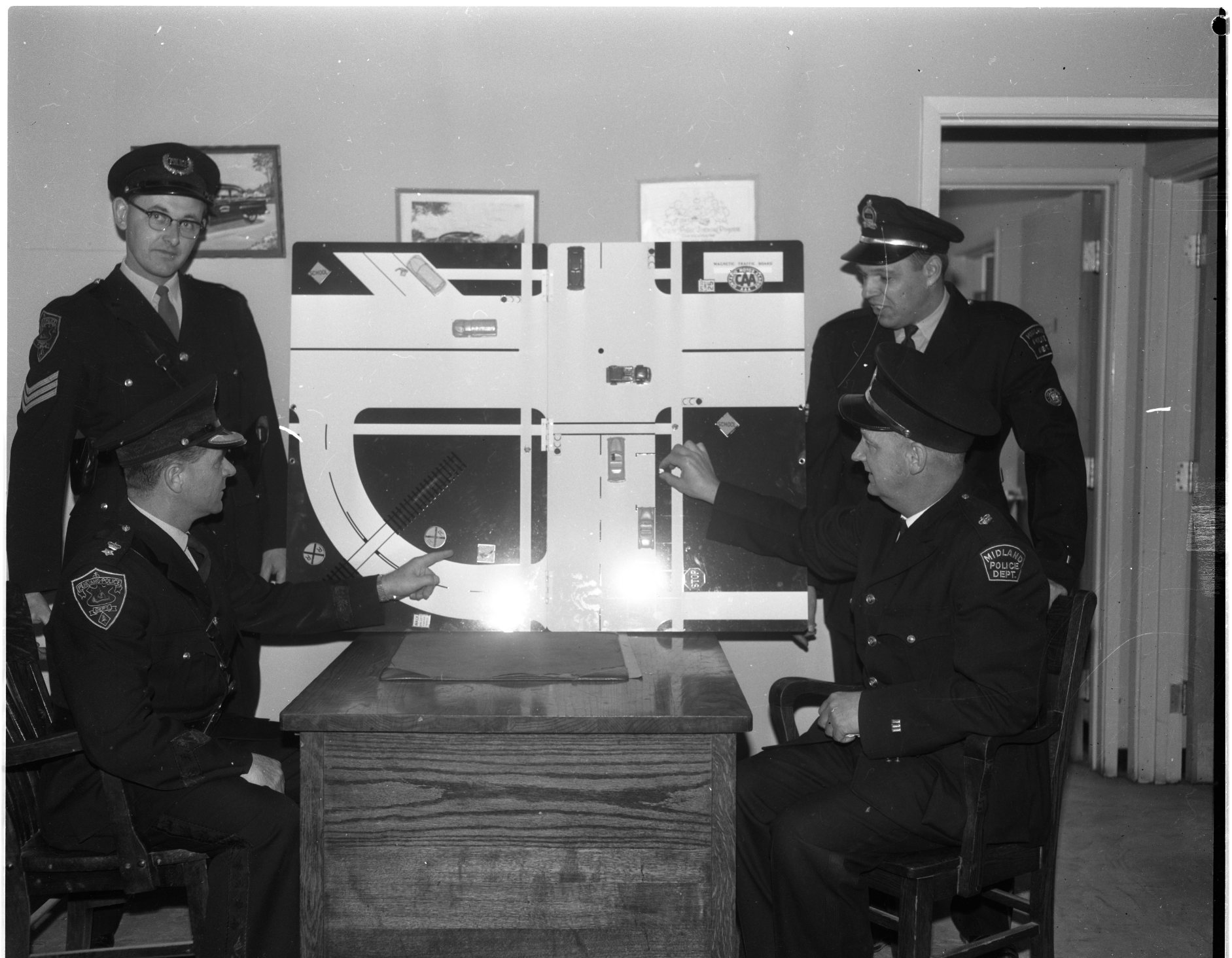 Donated by the Ontario Motor League, this new magnetic traffic board was designed for the effective teaching of traffic safety and analysis of accidents. Valued at more than $100, it will be used to instruct school patrols in Midland and Penetang. Chief Jack Arbour and Sgt. Marcel Dorion (left) of Penetang police, and Chief George Wainman and Sgt. Ernest Bates of Midland try out the new board.