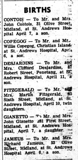 For the first time in many years, Midland’s St. Andrews Hospital staff members are cooing over two sets of living twins this week. Darlings of the nurses and visitors are the twin daughters of Mr. & Mrs. Martin Fitzgerald (Barb), Midland and a son and daughter of Mr. and Mrs. Harvey Seaton, Waubaushene. The Fitzgerald girls, top photo, named Barbara and Beverly, were born April 10. Soon they will be joining sister Kathy, 7, and brothers Michael, 5, and Patrick, 2, in the Fitzgerald home. Arriving five days later, on April 15, were the son and daughter, as yet unnamed, for Mr. & Mrs. Seaton. The Seatons are in some danger of running out of names. They already have eight children.