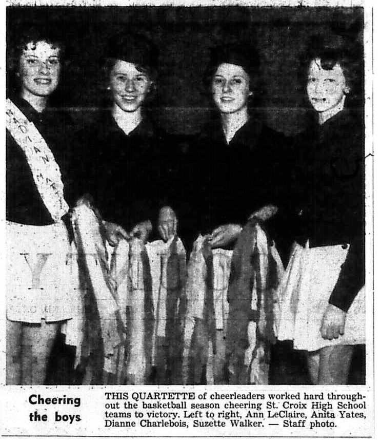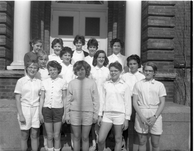 These happy girls are members of the Regent School team which won the Midland Public Schools basketball title. Left to right are, front row—Lois Belsey, Renate Matthias, Lesley Longworth, Valerie Harmsworth, Marilyn Jackson; Second row—Joan Fish, Lee Gilmore, Penny Vaillancourt, Carol Banting; Third row—Jo-Ella Courriere, Susan Heels, Mrs. Doris Barrett, coach, Valerie Somers, Ruth McQuirter. Not present when picture was taken was Judy Wilcox.