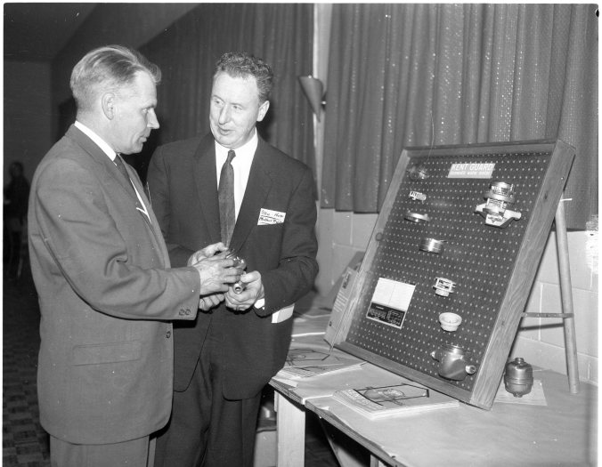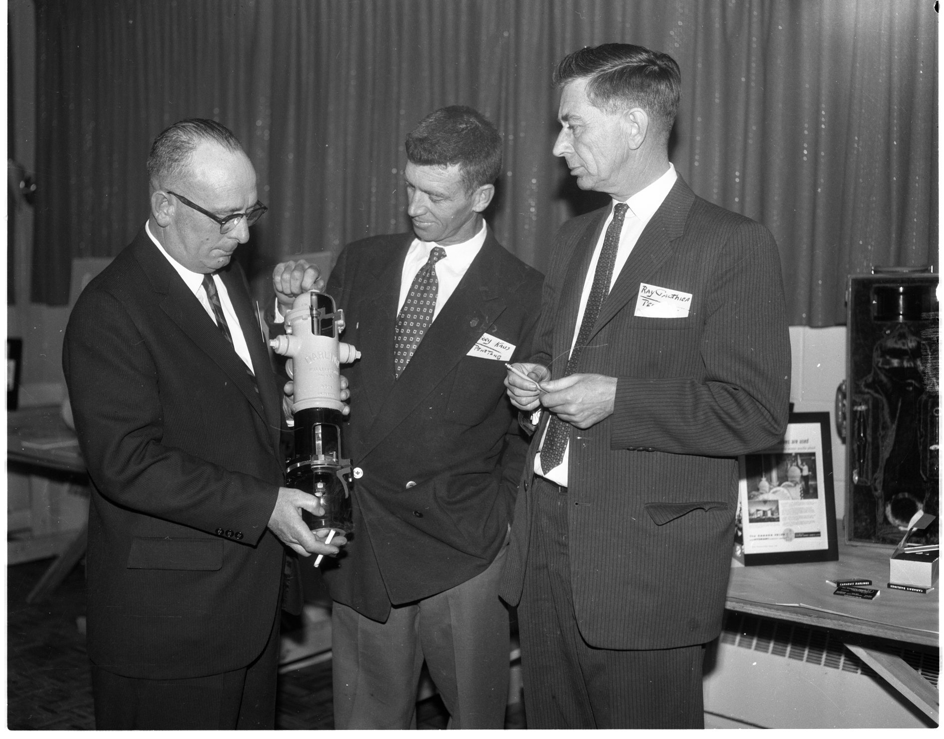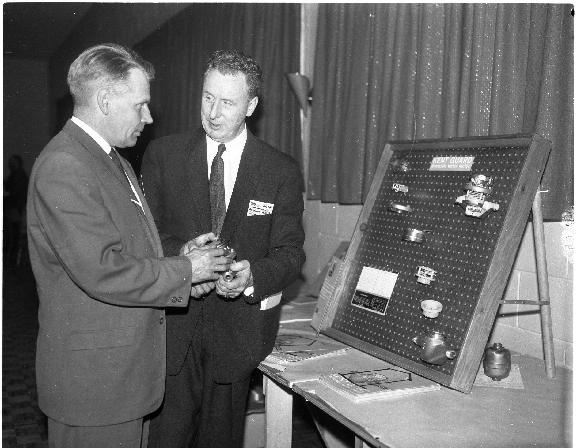 Well over 60 delegates attended the spring meeting of the Georgian Bay Waterworks Conference, held in the Legion Hall, Midland, last week. In TOP picture, Frank Holmes, left, and Stewart Holt, of Midland PUC, examine one of several types-of water meters on display. Three Penetang delegates, Martin Quigley, Jerry Kaus and R. J. Gauthier, are looking over a new-type valve in bottom picture.
