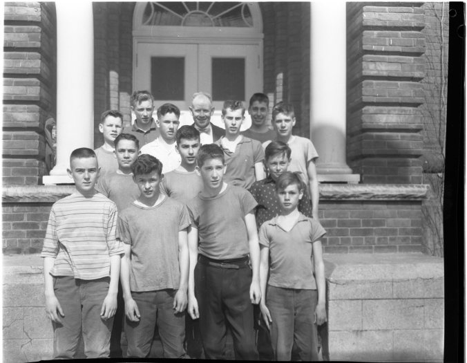 Regent public school won two basketball titles this year. Boys’ team includes, left to right, front row, Ian Dalrymple, Rickey Leaney, Calvin Todd, Herb Chapman; Second row—Brian Merkley, Laurie Thomas, Dennis Brabant; third row—Gerrit Huvers, Gary Crawford, Doug Langley, Bill Fish; Back row—Jurgen Baumann, coach Ken Trew, and Art McComb.