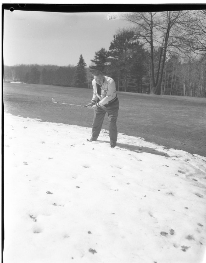 Although the temperature reached the 70’s during the Easter weekend, there was still snow around to the delight of some sport fans and the reverse to others. Murray Yorke has found a new kind of hazard in the form of a snow bank at Midland Golf and Country Club.