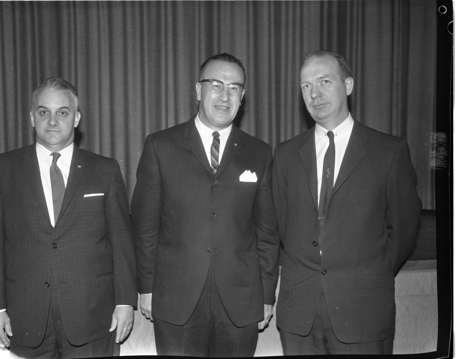“If we want to keep our tourists, we must fill the role of good hosts at all times.” So said Willard Kinzie, ex-Barrie mayor and now Zone 3 chairman of the Georgian Bay Development Association in an address at St. Paul’s United Church, Wednesday evening. Mr. Kinzie was speaking to a joint meeting of United, Presbyterian and Anglican Church Men’s Clubs. Walter Lumsden (Knox), Willard Kinzie, Clint Truax (St. Paul’s)