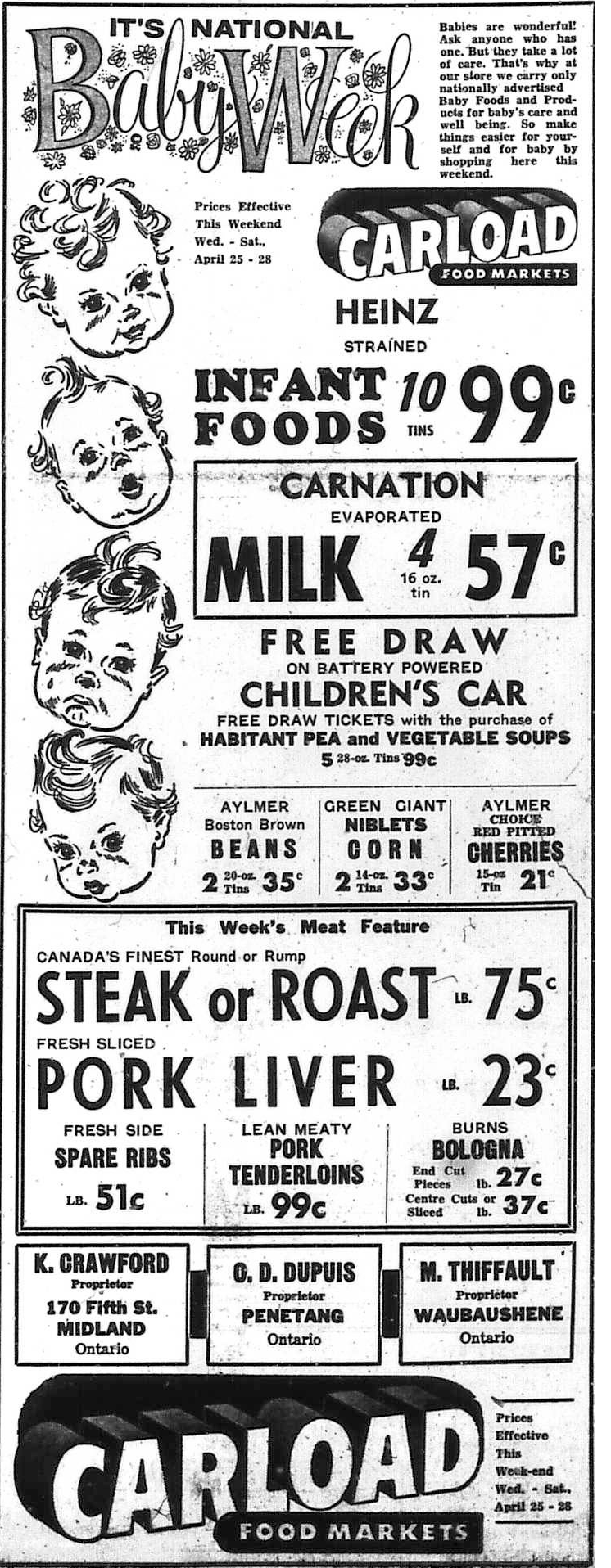 When I saw this ad it reminded me of a previous post from February 1961 when the store opened. That caption read; The small corner grocery store that used to be known as Ken’s Marketeria at 170 Fifth Street is no more. Now three times as large it has blossomed forth as Ken’s Carload Marketeria, a greatly enlarged and remodelled building. Born and raised in Midland, Ken Crawford operated the old store on the same site for the past nine years. Last fall Burke Construction Co. began the work which has resulted in the sparkling new retail store on Fifth, at the corner of Montreal. In keeping with the larger building, Mr. Crawford has extended his lines to include meats, groceries, fruits, candy, drugs and sundries— “all the things you can get at the big stores downtown.” the proud owner pointed out. Ken was just a boy when he began learning the meat business under the late W. J. Bowman in the store now occupied by Gianetto’s. He served 9 1/2 years with Mr. Bowman. This happy story had a grim ending as related to us by Ruth Jeanotte. ” Ken and his wife never had any children, they were in a terrible car accident in 1975, their car was hit from behind and the gas tank blew, he fought to get his wife out of the car and he was badly burnt, his wife died of her injuries, he later worked at Loblaws store on King St. and Elizabeth.”