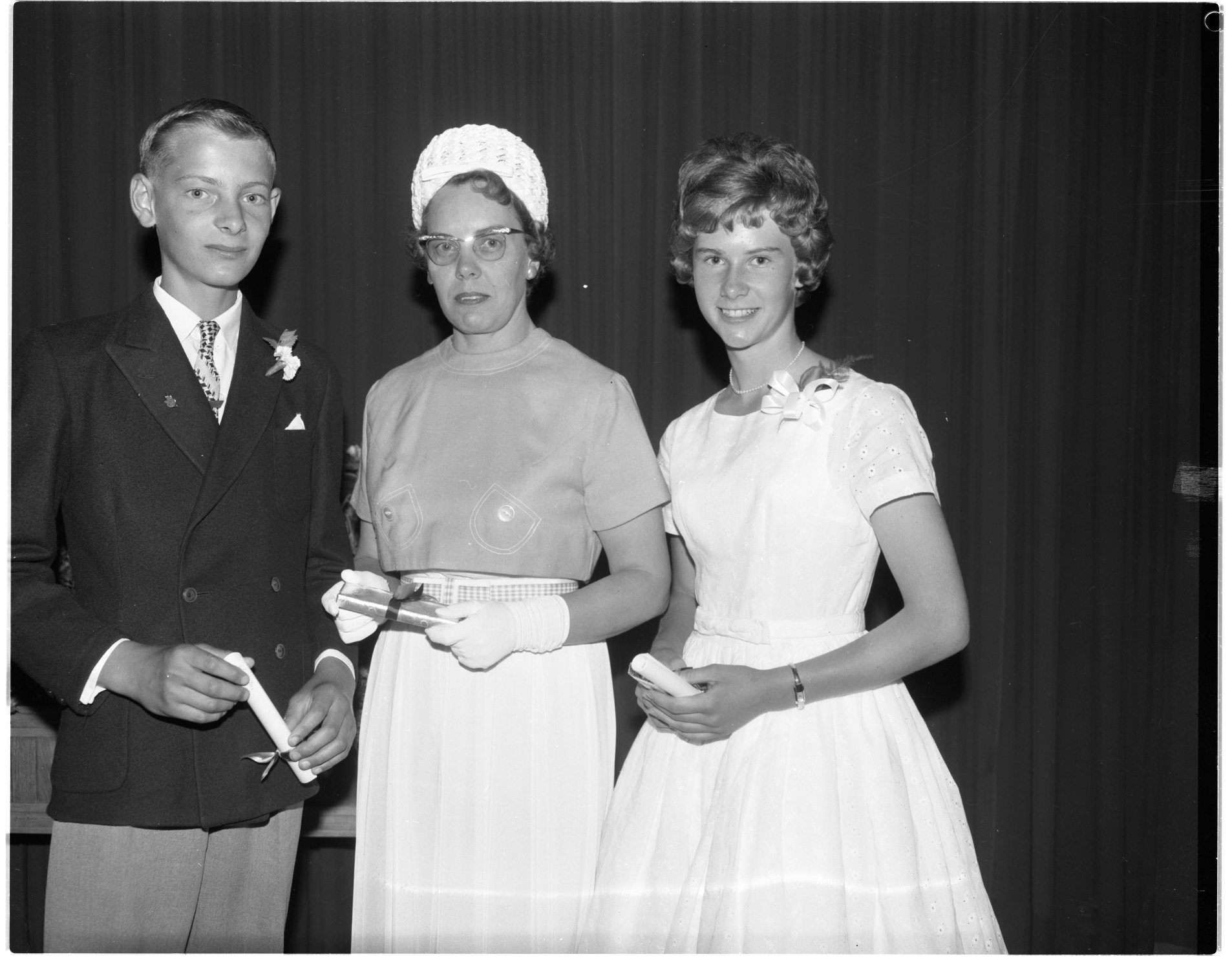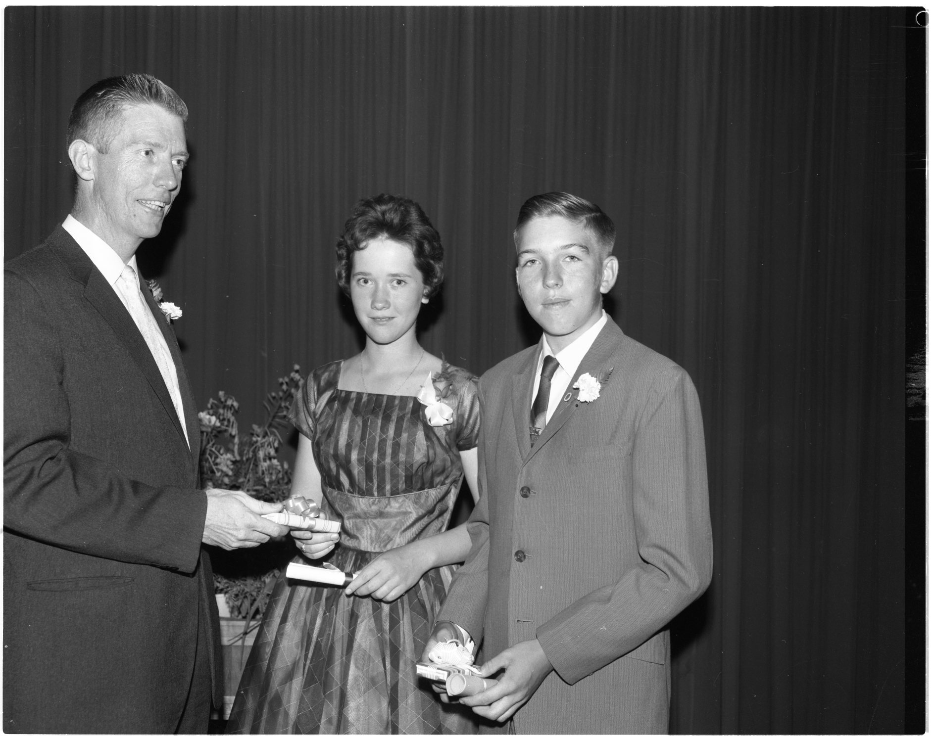 Graduation night brought a number of special awards to Parkview Public School pupils. In this picture, Mrs. C. L. Weckman presents Home and School Association merit awards to John Wilcox and Glenda Stewart.