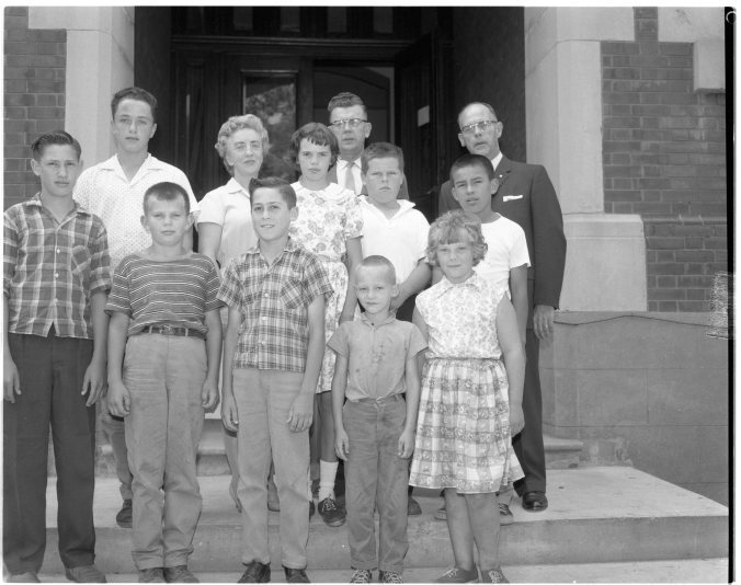 Getting to the school on time, every day of the year, was no great problem for these Port McNicoll youngsters, all of whom boast perfect attendance at the public school during the 1961-62 term. Left to right are, front row — James Richardson, Kenneth Young, Rinalo Succitelli, Stephen Lawson, Susan Young; back row — John Sekleski, Mrs. A. McCullagh, member of the school board, Ann Crosato, principal L. Thorpe, John Lever, Wayne King and board chairman Ray Belanger.