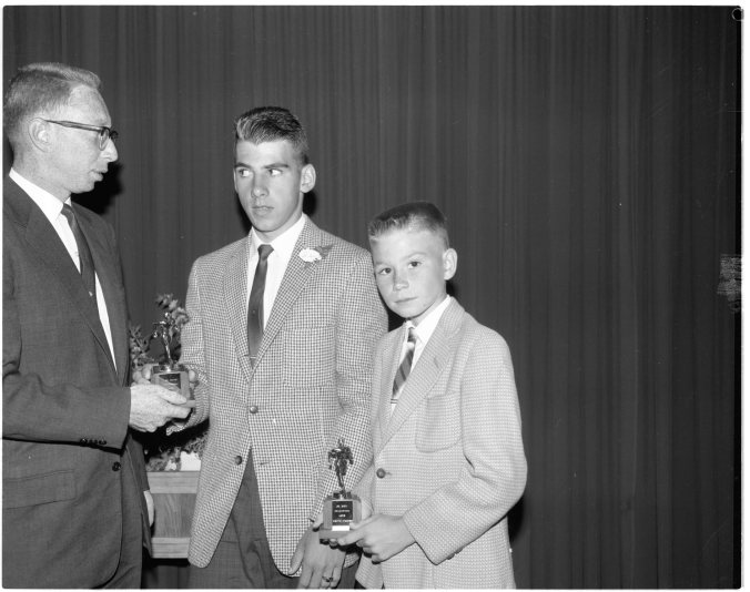 Sports were not forgotten at the annual grade eight graduation exercises held at Midland’s Parkview School last week. Here John Soden, left, presents field day trophies to Jim Roduck (centre) and Keith Tippin. Jim broke a number of public school records at a recent meet.
