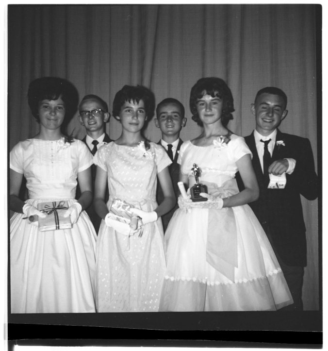 This happy sextet from Regent School are (left to right) Joy Morrison, winner of the IODE award for highest standing in history, Robert Guthe, senior boy award winner, Wendy Short, senior girl award winner, Ian Dalrymple, winner of Y’s Men’s leadership award, Linda Russell, senior girl sports award, and William Jory, senior boy award winner.