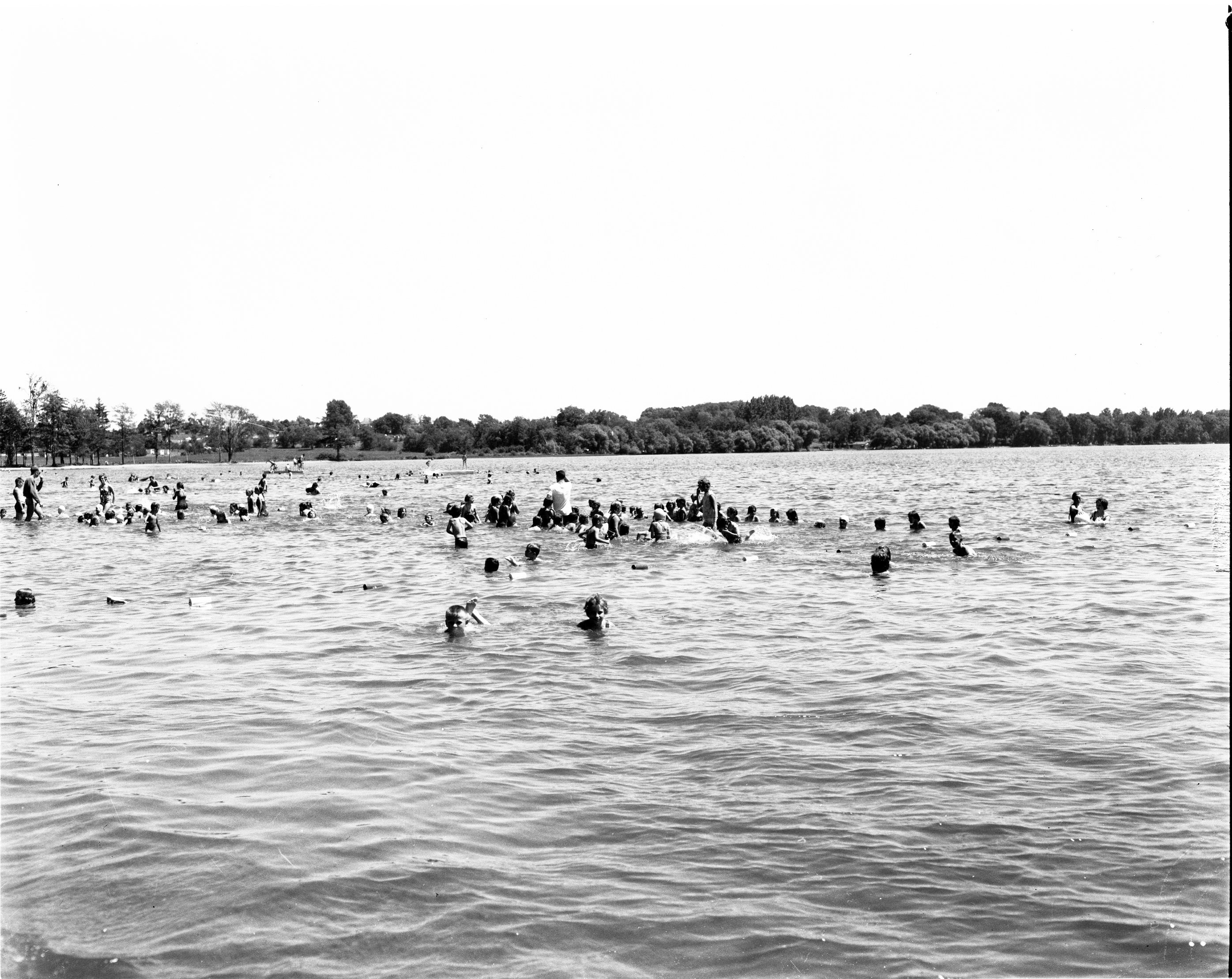 Learning to swim is still the main object of the more than 400 children, including 120 from Victoria Harbour at Little Lake. One of the instructors is seen above giving a group of the smallest tads their first instruction in the art that may one day save their lives.
