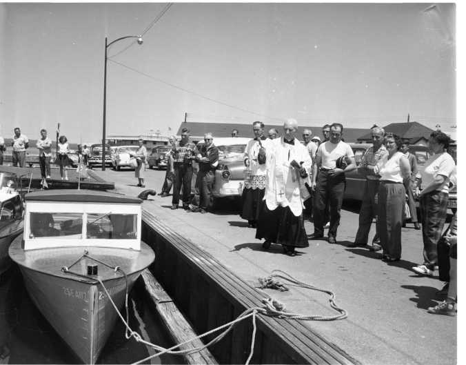 MSGR. J. M. Castex, assisted by Father J. Kelly blessed the boats of Penetang Boat Club Sunday afternoon, shortly before the flotilla took off on their first outing of the