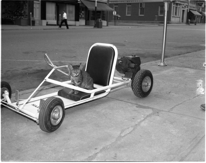 “Well let’s go, what are we waiting for?” seems to be the big question on the mind of this pussy cat, which makes its home at Midland Flour and Feed store. Pussy lost her favorite sun seat when owner Clive Park unfeelingly sold the motor scooter a couple of days after this picture was taken. “Never even bothered to consult me,” wailed pussy.