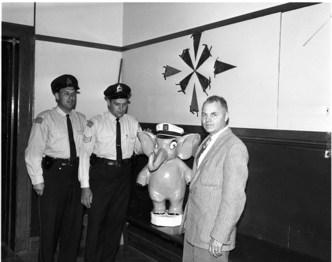 The last day of school was a proud one for pupils of Midland’s Sixth Street Public School. The boys and girls were awarded Elmer, The Safety Elephant, for having the least points scored against them during the latter part of the term. Sgt. Ernest Bates of Midland Police Department presented Elmer to Principal Ken Cowan, while Const. Arthur Ambeau looked on. The two officers and Mr. Cowan gave pupils a safety pep talk prior to the presentation.