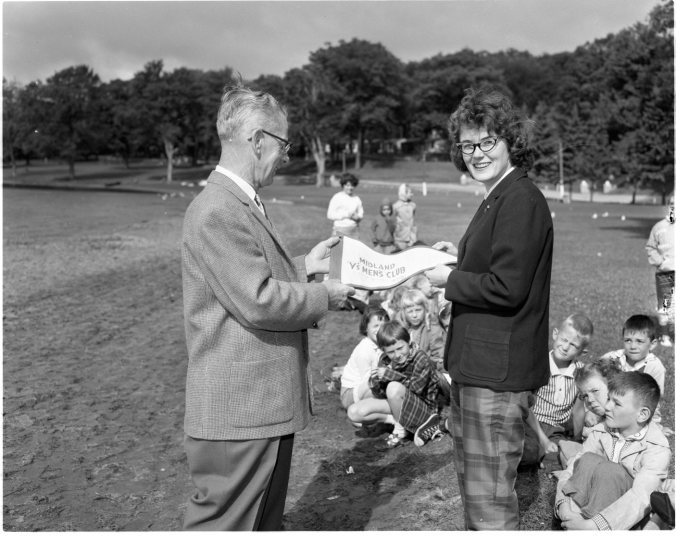 Another banner season of summer programming under the sponsorship of Midland Y’s Men’s Club got under way at Little Lake Park this week, with 320 boys and girls registered as of yesterday noon. While a majority of the 320 children are from Midland, many others are enrolled from neighboring villages and from the tourist camp in Little Lake Park. So far frigid temperatures have marred the program’s most popular item — swimming. This is as disappointing to the parents, anxious that their youngsters learn to swim, as it is to the boys and girls themselves. “This morning” said playground director Carolyn Taylor, “we had to give the children instruction on dry land. It was too cold for us, too, as well as the children,” the young Owen Sound girl admitted. An Instructor at the Y’s Camp Kitchikewana for several seasons, Miss Taylor is receiving help from Lois Ramsey in the swimming end of the program. Other leaders include: Paul Howard, senior boys, Junia Corcoran, senior girls, Betty Jean Watkinson, junior boys and girls, Mary Lou Graham, crafts.