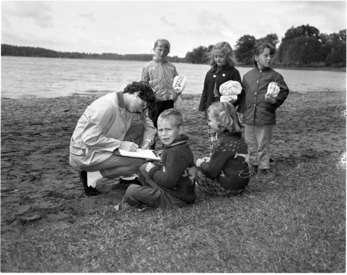 Garbed in heavy sweaters and jackets, these children are being signed in for swimming lessons by Betty Jean Watkinson, one of the instructors in Midland Y’s Men’s Club’s summer playground program at Little Lake. Because of the cold mornings, swimming classes are being held in the afternoons this year. More than 300 youngsters have signed up for the classes.