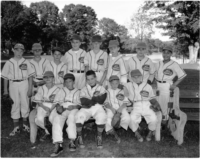 June 25th saw the wind-up of another Little League baseball season in Midland, with playoffs at Parkview Field. Captains of the teams are seen above. Front row are International League captains, left to right. Bill Smith, Terry Dubeau, Doug Gagnon, Lloyd Graham; second row (National League) are Paul Denis, Bob Clayton, Jurgen Baumann, Bill Graham. At back are three of the men who helped out, H. Richards, F. Allsopp and Frank Graham.