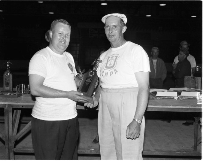 End of a long day (25 games) saw Elmer Hohl of Wellesley emerge the winner of the “A” class title in the Ontario Horseshoe Pitching Association championships in Midland Arena Gardens. Hohl (right) is seen receiving the Carling’s trophy from Ken Stonehouse of Midland Jaycees who sponsored the event.