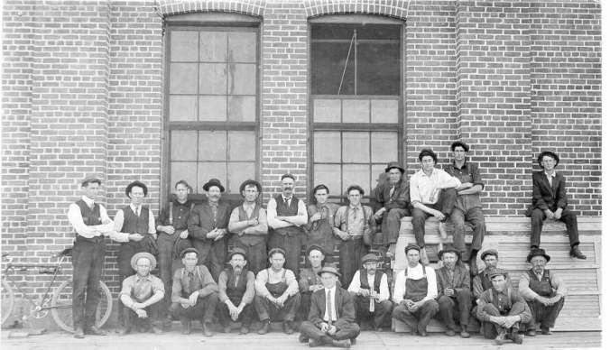 Work has resumed on Midland’s portion of the winter works program, sponsored jointly by municipal, provincial and federal authorities. Men above are installing a new cement curb on Ruby Street, despite wintry conditions. [Note the “Copeland & Strong plumbing, sheet metal, appliances” sign and the large display windows. The building later became Strong,s corner grocery store, then part of Armstrong ‘s Dairy stores.]