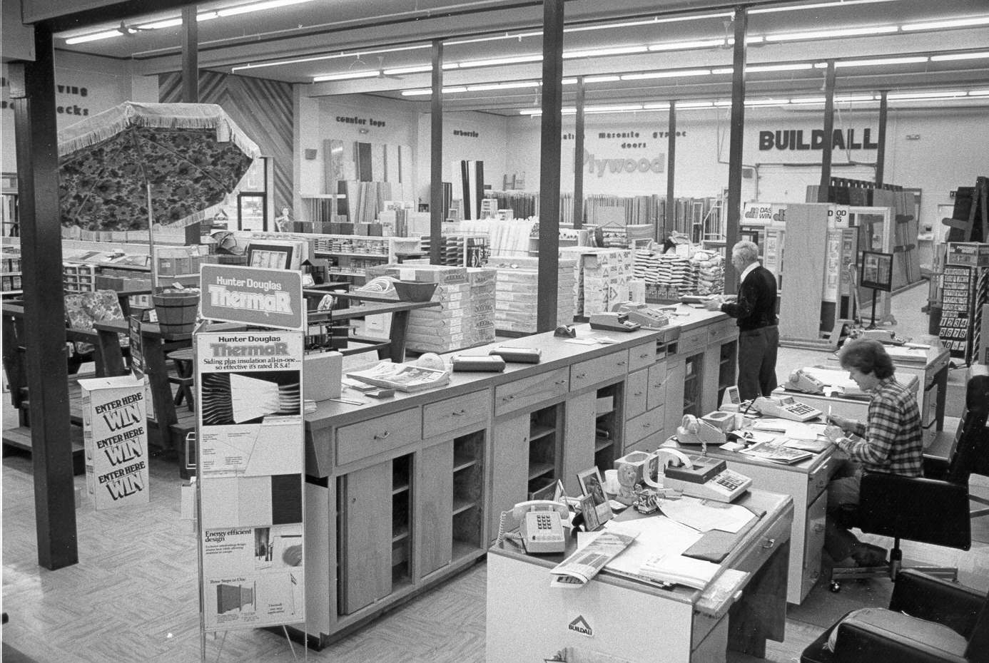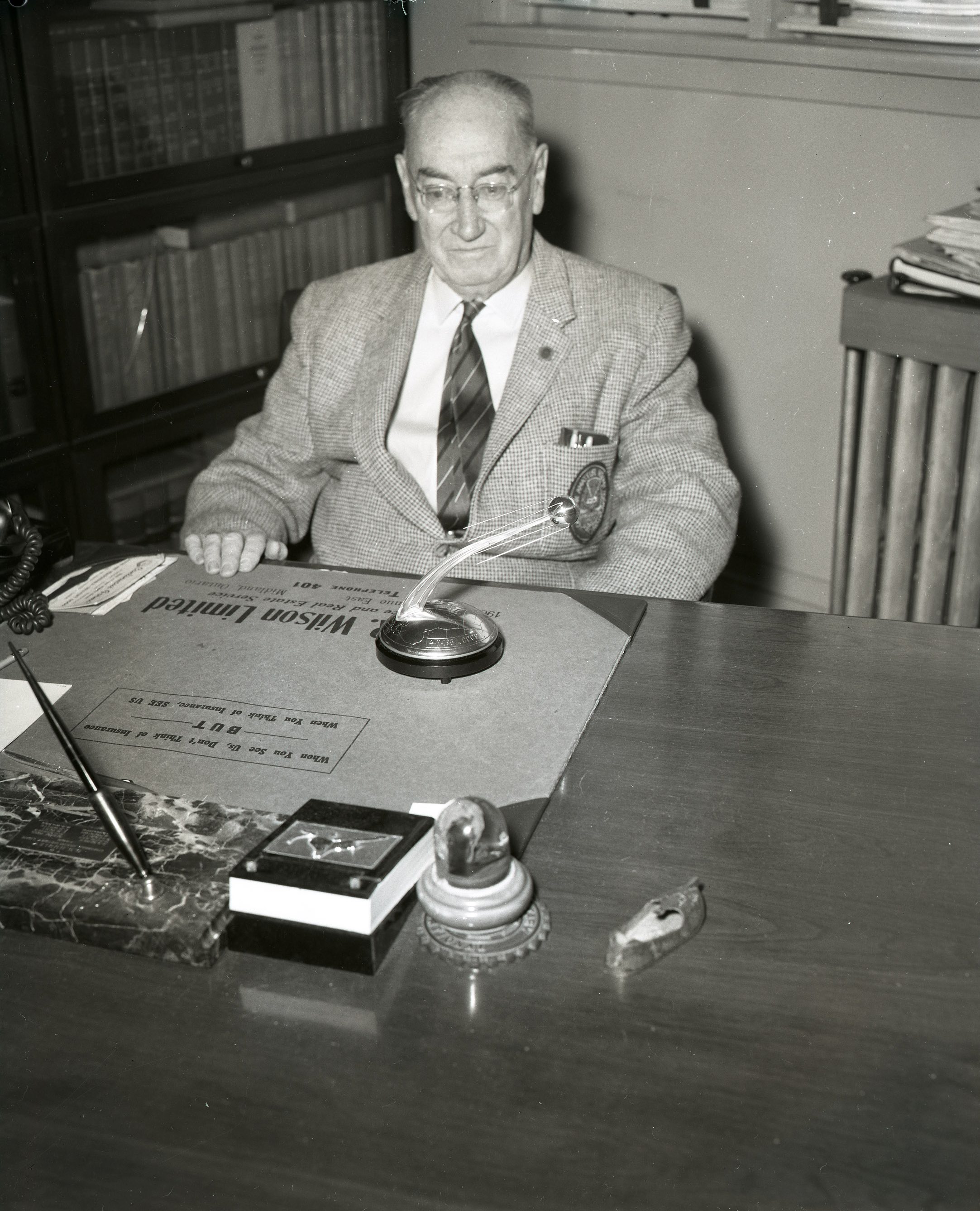 (Ernie, seen on the left, had been a sales representative for the distributor of Eureka cleaners when he lived in Kitchener, his calls in the Georgian Bay area and his association with H. J. Thompsons and Sons Ltd. encouraged him in 1959 to move here and continue his sales career with Thompsons. Ernie died last August but his company, Mink Insurance, under the guidance of son David, continues to flourish in Midland.)