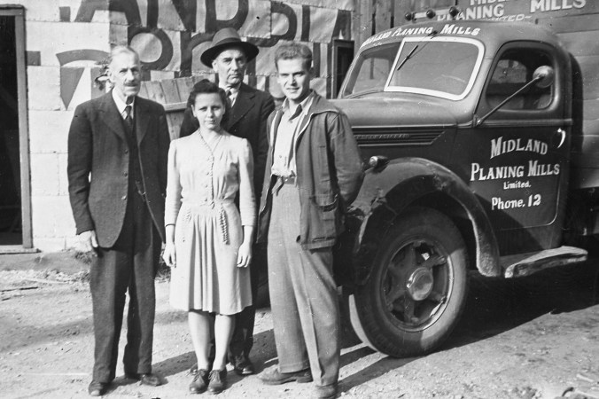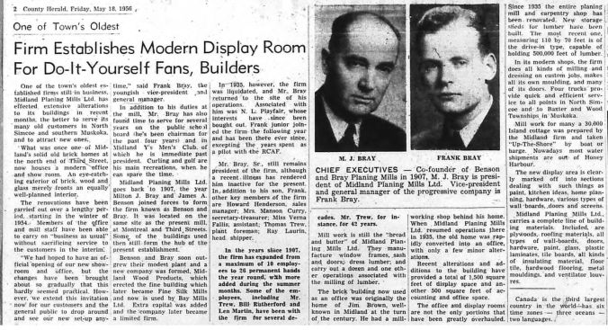 Ownership of one of Midland’s oldest industries has changed hands. Announcement of the purchase of the Midland Boat Works, said to have been founded in the 1880’s, was made yesterday by John MacRae and Ken Thistle, two young businessmen in Toronto. Principal shareholders in the newly reorganized company, Mr. MacRae said the purchase was completed Jan. 25. The purchase price was hot revealed. The new owners stated their present plans call for an expansion of boat storage facilities, the extension of dock facilities to double the length of existing docks with “arms” added to provide extra accommodation. Gas pumps are also to be more conveniently located, they said. Both single men, Mr. MacRae is 30 and Mr. Thistle is 31. The parents of the two men own cottages at Wymbolwood and Balm Beaches, respectively, and have summered in this area for many years. Mr. MacRae has stored his 20-foot cruiser at Midland Boat Works for the past three years. Other members of the board of directors of the newly reorganized company, which will retain the name of Midland Boat Works, are Tom McCullough of Midland, J. B. Kennedy of Toronto and Balm Beach and Richard Perry, Toronto solicitor. Superintendent of the boat works since 1912, Len Cowdrey will remain in that capacity with the new company. Founded in the early 1880s by “Pop” Smith, a canoe builder, the boat works was later purchased by John Hacker. Mr. Hacker sold his interests to Capt. John G. Gidley and the firm became known as J. G. Gidley and Son. Shortly after World War I, Mr. Gidley sold the business to Ganton Dobson. In 1922, the Honey Harbour Navigation Company, headed by N. K. Wagg, bought the small pleasure craft division of the boat works from Mr. Dobson. In 1941 the same firm bought the remaining Dobson interests known as the Georgian Bay Shipbuilding and Wrecking Company. In 1945, Midland Boat Works became the official name of the firm. During World War 11, the plant produced seven Fairmiles and two minesweepers in addition to other smaller naval craft and army pontoons. Since the war it has built small pleasure craft and in 1957 completed a 96-foot coastal patrol boat for the Royal Canadian Navy.