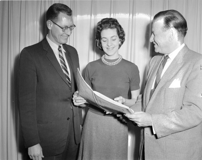 Her reign now nearly over, Gisele Bezner, 1959 Queen of Hearts, will give up her crown to her successor on Feb. 11 in the Roxy Theatre when a new queen will be chosen. Red-haired Gisele who hopes to be here for the pageant, is now in residence at Whitney Hall at University College, Toronto, studying to become a secondary school teacher. Her course is Honor English. The contest is sponsored jointly by businessmen of Midland and Penetang and Roxy Theatre manager, Wilfred LaRose. Contestants for the Queen of Hearts contest are chosen on a popularity basis by students at Midland Penetang District High School. From grades eleven, twelve and thirteen, the girls aspiring for the Queen’s crown were the top ten in number of votes polled. By general agreement, the girls wear a sweater and skirt school outfit on the first elimination night (Thursday) and the following week the five finalists will wear the gown of their choice from a selection of styles by Celebrity Formals.