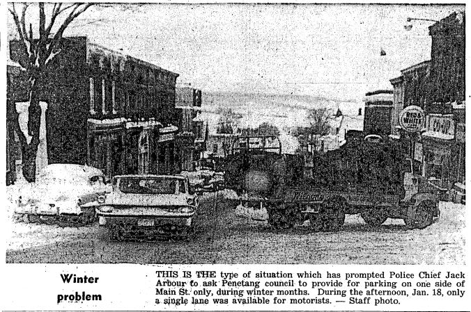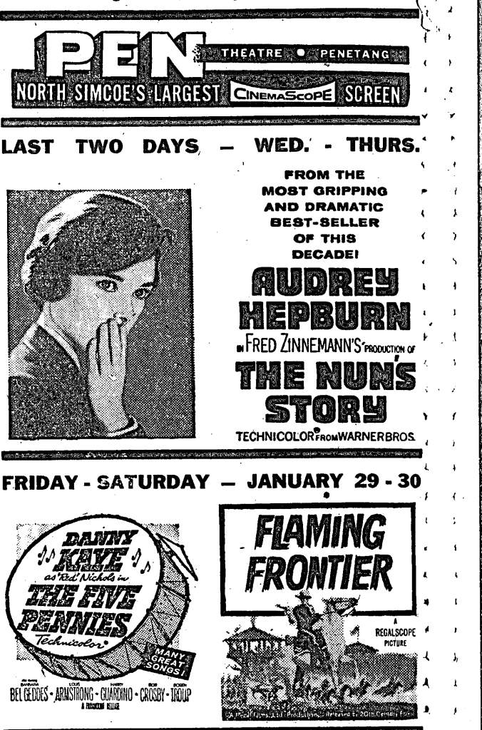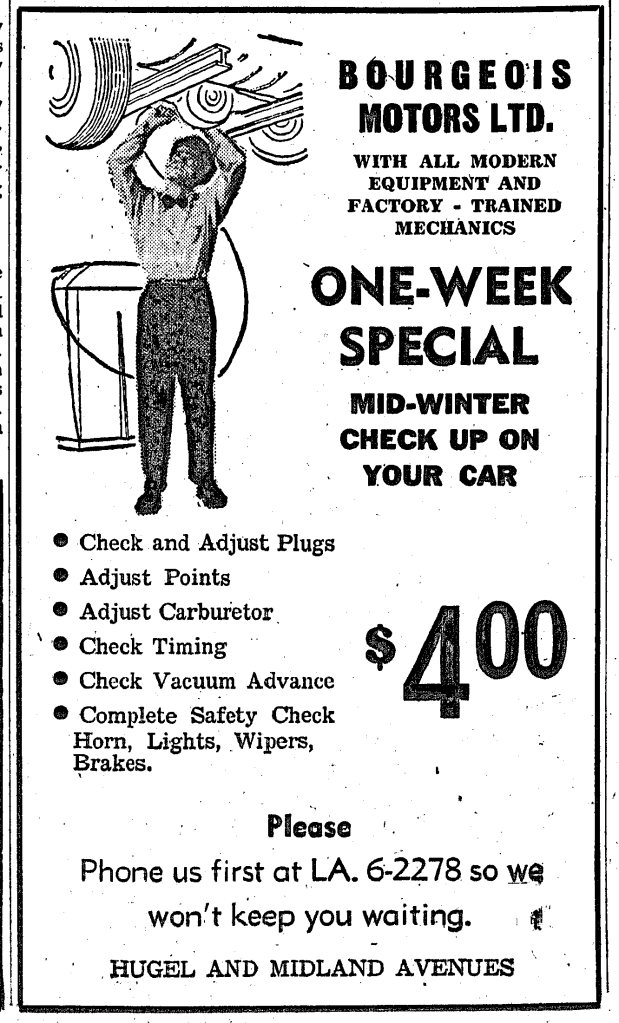 TEN YEARS AGO THIS WEEK – Continuing mild weather led to cancellation for the year of the annual winter carnival at Penetanguishene. Outstanding among the expected events were “scoot” races. It was feared ice would be unsafe for contestants and spectators. * * * A middle-aged Honey Harbour guide was seriously burned attempting to light a fire in the kitchen stove with kerosene. Flames shot out of the stove and entered the can, which exploded in his hand. * * * It was reported that losses encountered on the care of indigent patients had caused a deficit in St. Andrews Hospital finances. The deficit was about $5,000. * * * A speaker before the Ontario Municipal Board said, in part: “The town of Midland is a compact, homogeneous and progressive municipality. It has dynamic industrialism. It shows commercial enterprise and growth.” * * * Two Midland curling club rinks had visited the international bonspiel in Quebec City the previous week. One was composed of “Smoky” Wood, Ange Hartman, Karl Bertrand and Ernie Nicholson, skip; the other, Vern Johnston, Tom McCullough, Cy Ney, and Ab Hartman, skip. The two rinks came into competition and the Hartman rink won. “A good time was had by all.” * * * Al Perkins, manager of the Roxy Theatre, won a special showman award for ingenious promotion of the film “Father Was a Fullback.” To this end, he had enlisted the combined support of high school football [One of the few times we have composition errors in the paper, the balance of this item and the beginning of the next were missing] Harbour was selected as “Campus Queen.” * * * People were still talking about “the new look” in styles and hair-dos.