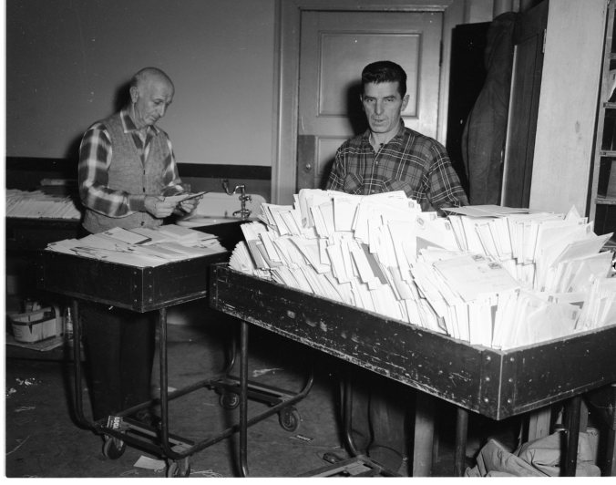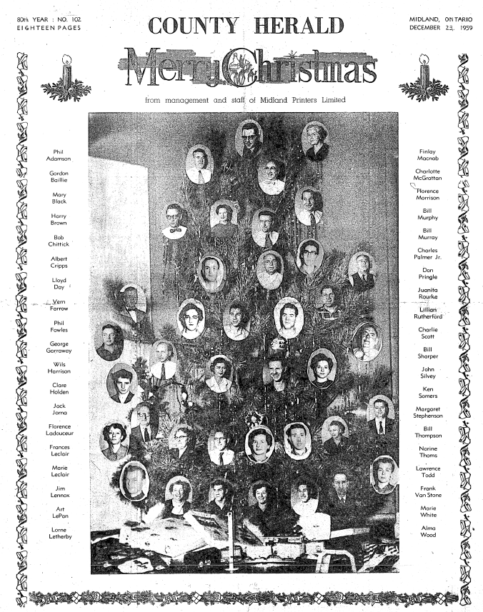 Midland’s council for 1960 is seen above following inaugural ceremonies at the municipal building Monday. Left to right, seated, are Deputy-Reeve, Clinton Smith; Mayor, Charles Parker; Clerk, William Hack; and Reeve, Herb J. Beauchamp. Standing are Aldermen James Mackie, William Orr, Douglas Haig and Percy Crawford. (Note the image was reversed in the newspaper, hankies on the wrong side, we have left it that way so that the newspaper caption lists the names in proper order.)