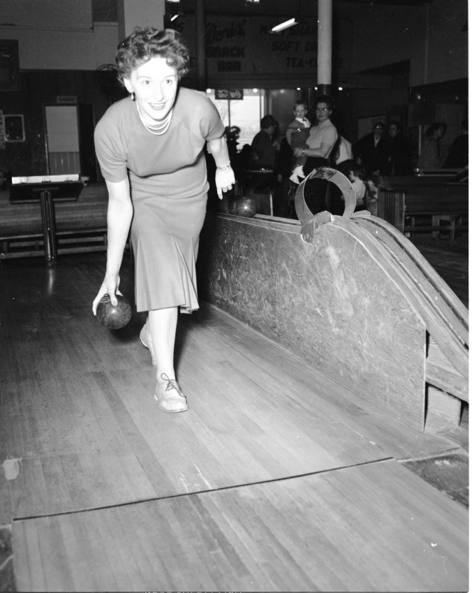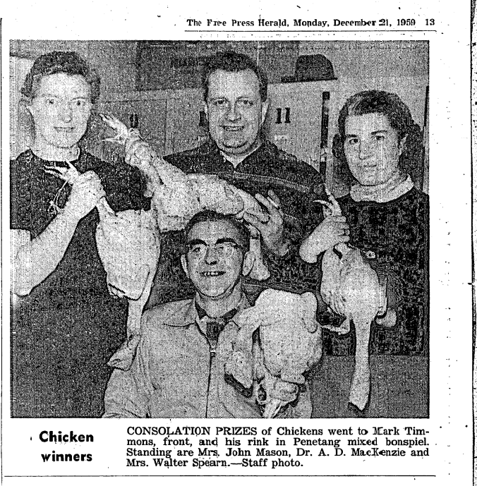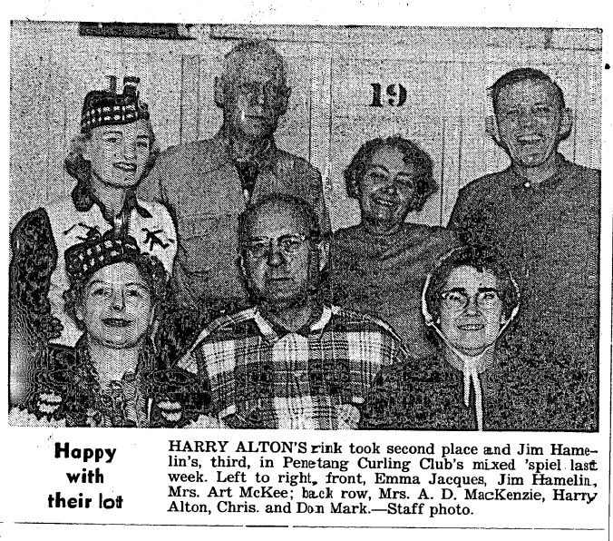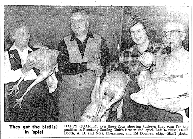In the first spiel of the season held by Midland Ladies Curling Club January 6, a novice rink skipped by Mrs. Godfrey Trilsbeck of Penetang sprung a surprise by winning one of the top prizes. They are left to right, Mrs. Walter Spearn, Mrs. Orval Ambeau, Mrs. Len Carter and Mrs. Trilsbeck, with Mrs. Norman Greene, chairman of the bonspiel committee.