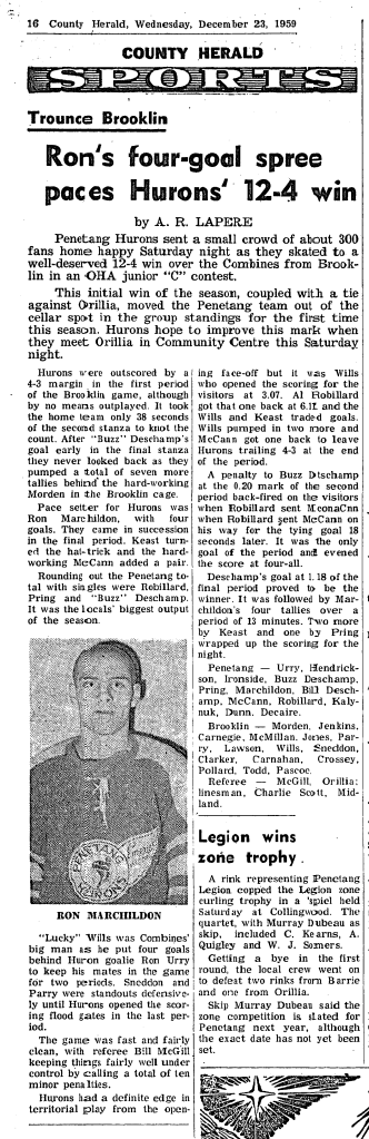 Coming up with one of his greatest efforts in a long career, Midland Flyers’ Morley Spiker scored five of his team’s goals in a 6-4 win over Meaford Chevvies here last Wednesday night. Spiker is seen poking the first of his quintet behind goalie Elgin Cubitt while Meaford forward Barney Walmsley (10) rushes in too late to help. Flyers host Collingwood here tonight.
