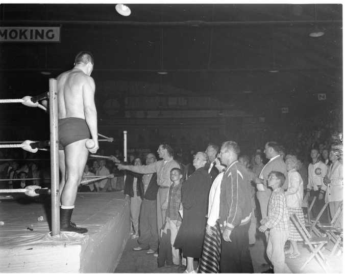 Pete Pettersen shows Marie Raco and Julie Lang, both from Guelph and cottaging at Balm Beach, how he intends to hold an international ski jumping competition here on August 3, 4 and 5. Workmen above are spreading straw on the 300-foot run which will be held down by chicken wire then covered with snow made with an estimated half million pounds of ice. (If you had believed the Toronto papers of the day Midland would have been covered with snow in August, the Globe and Mail had reported 200,000 tons would be used, the Star reported a million tons.)