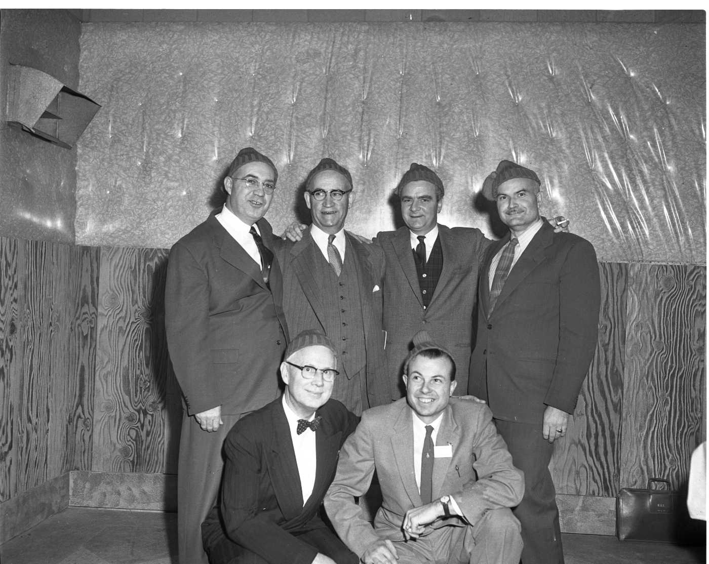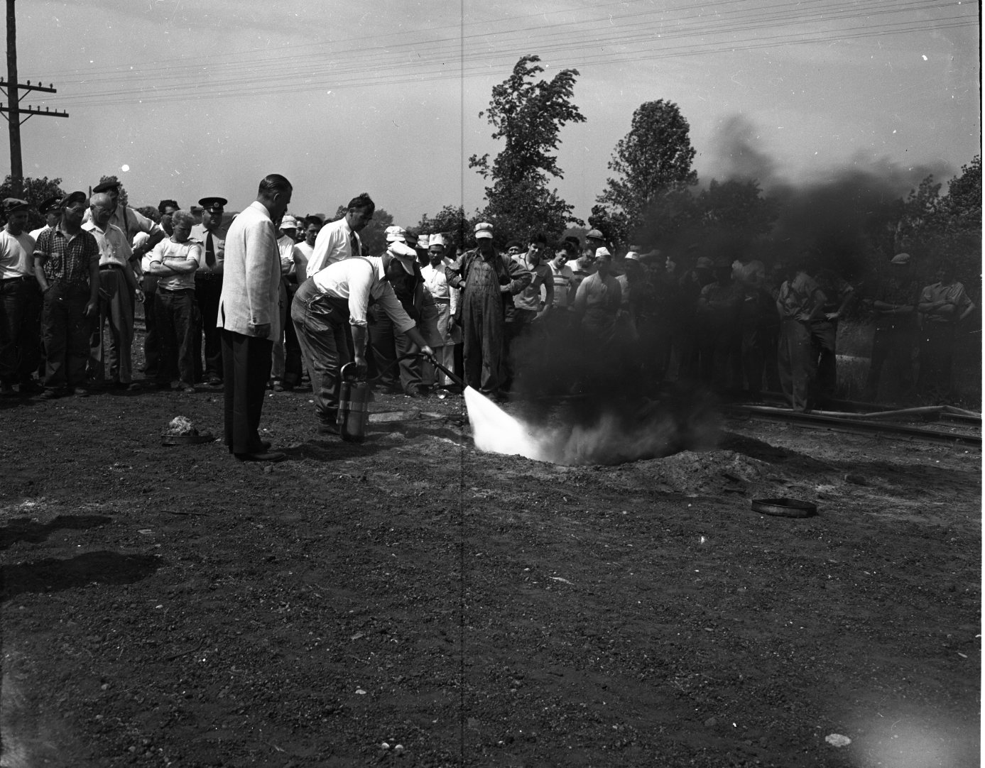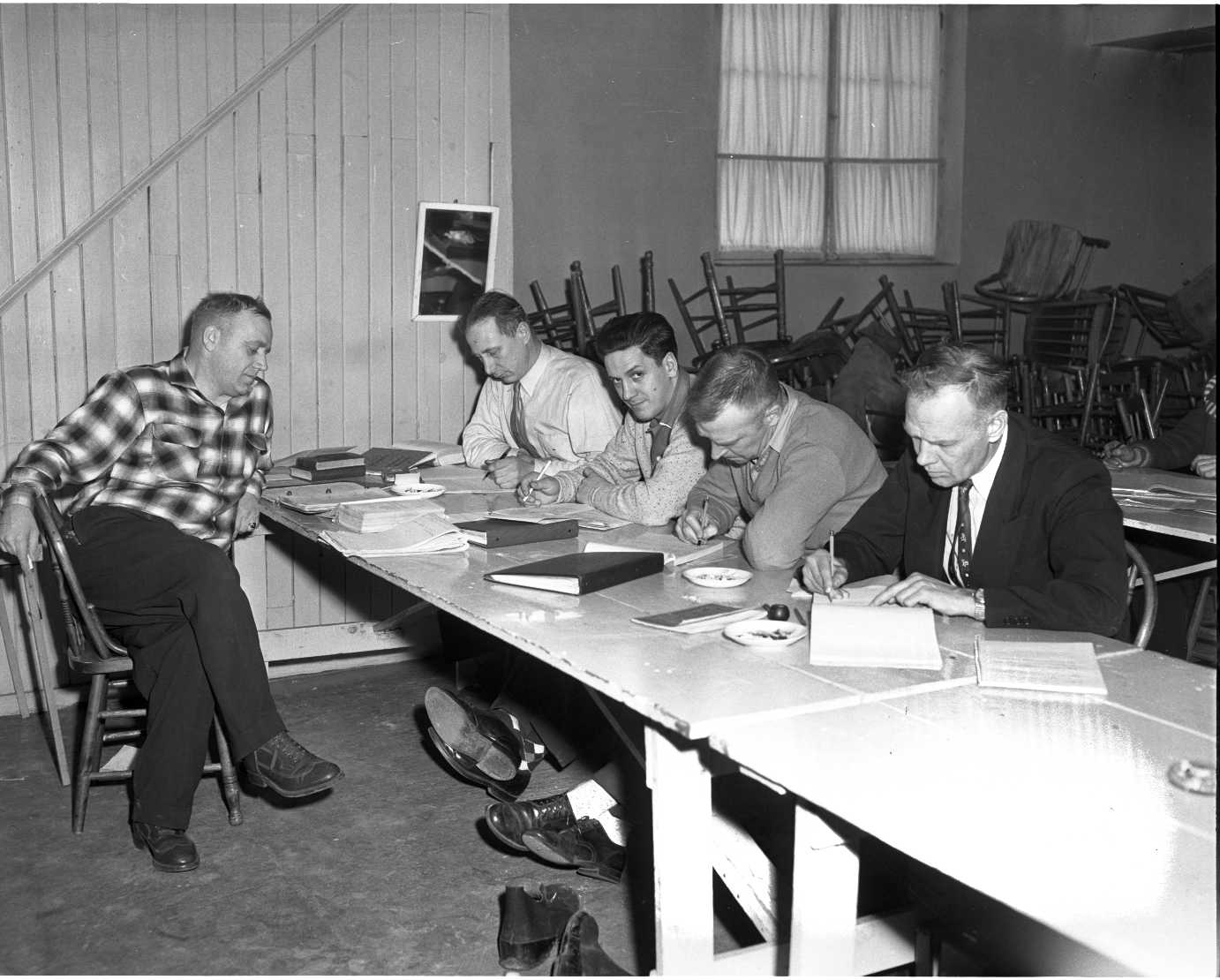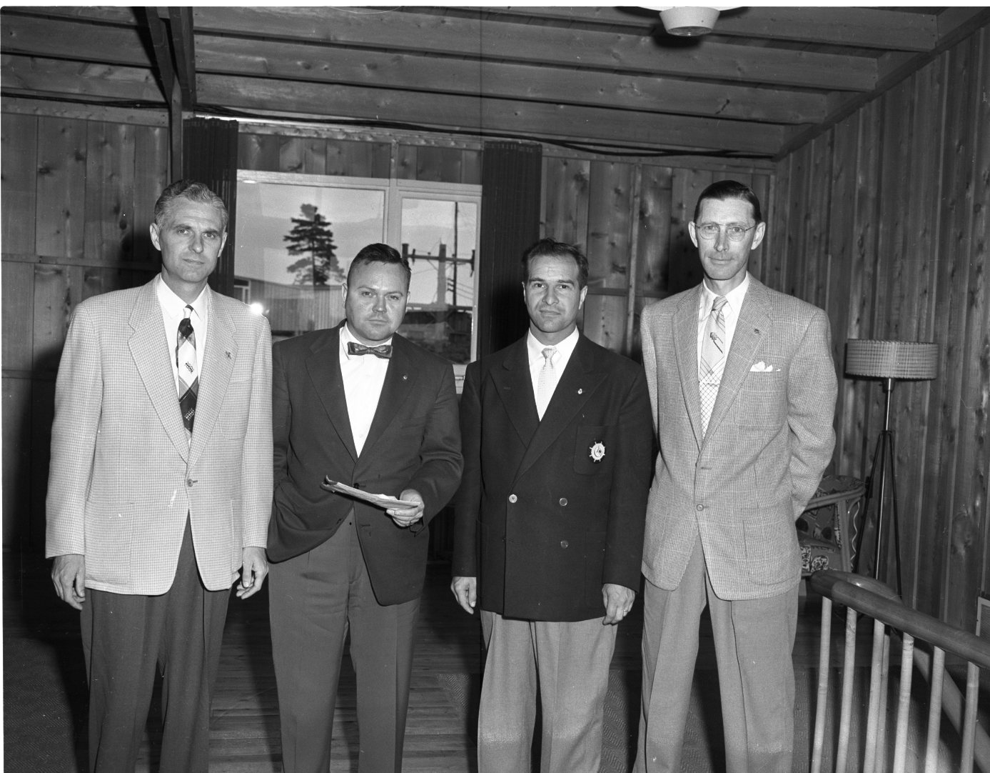 Midland firemen are displaying one of the certificates they earned for passing the recent county fire instructors course in Barrie, conducted by the Ontario Fire Marshall’s office. Dave Hudson, Chief Arnold Tippin, Harold Hamilton, Fred Grigg and W. E. Allsopp who studied such things as the ways of fighting fire, ventilation, forcible entry at least cost, ladder work, extinguishers and pumping. The course was one night a week for 20 weeks.
