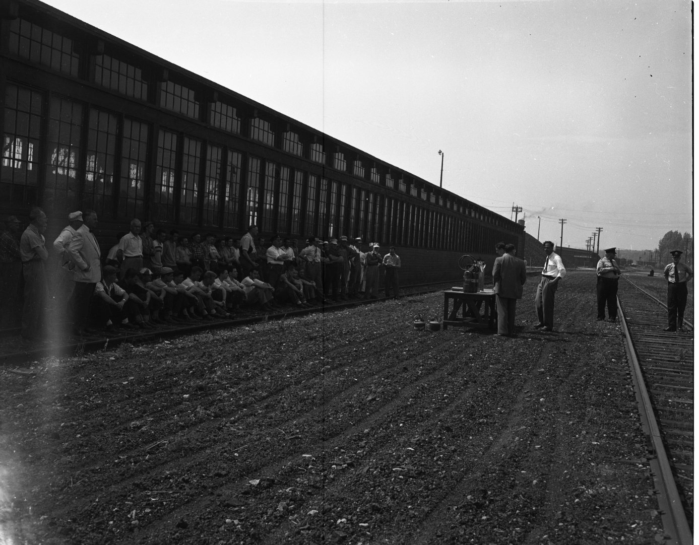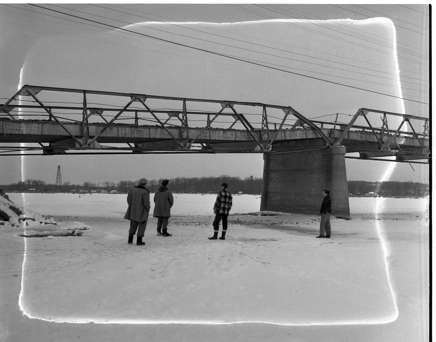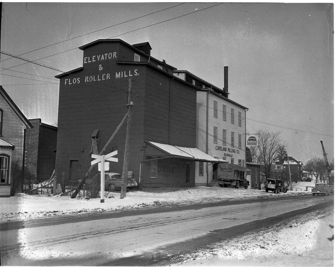 Browns Bread transport halted by glare ice on the roads has to be unloaded into smaller trucks, corner of Elizabeth Street and Midland Ave. Freezing rain has disrupted travel in the area. The fare on many Midland tables was a bit light at lunch hour as housewives waited in vain for milk, grocery and other deliveries, delayed by hours. All morning long the whine of spinning tires was the most common sound to be heard around town.
