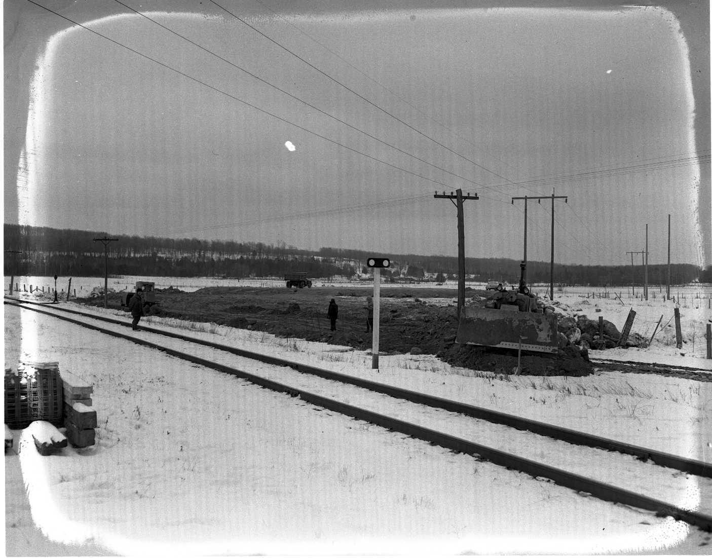 Junction (Firth’s Corners) of Hwy 12 and Cty Rd 6 (Balm Beach Road) just west of Midland is being realigned. Gone are the old red house on the far corner and another house that stood almost dead center in this picture. The road on the right is Yonge Street which will be moved into the space being cleared, moving the junction several hundred feet further south. This was the scene of many serious accidents, partly due to the house that has been removed obscuring sight lines and the steep grade from the Balm Beach road to Highway 27, that difference can still be seen from the Full Line Electronics & Shoppers parking lot to the highway.
