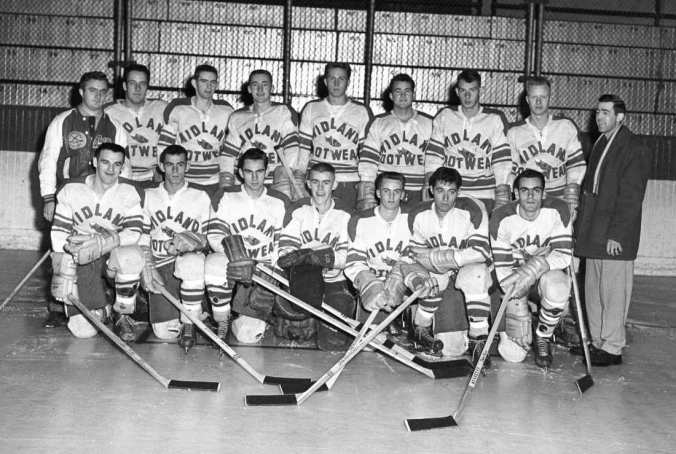 Current edition of Midland’s junior Red Wings is seen here. They will be out to redeem themselves against Lindsay at Arena Gardens Thursday night following a trouncing by Newmarket Monday. Wings won their other game to date, in Parry Sound. Left to right are — front row, Bob Pewer, Ross Irvine, Bob Scott, Roger Grey, Harvey Jackson, Ken Simms, Jim Lemieux; back row—Harold Jackson, Don Ring, Dave McCall, Clare Armstrong, Bill Quinlan, Bob Pickering, Dalt Cruise, Gord Brand and coach Garnet Armstrong.