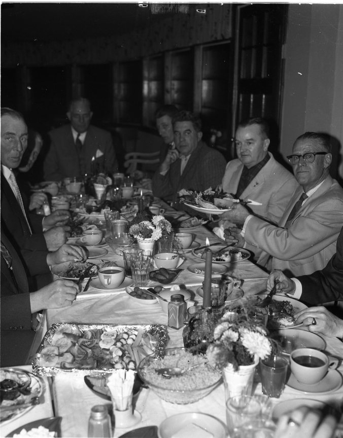 Members of Crossland Women’s Institute are seen above just before the start of ceremonies marking the 50th anniversary of that Centre Flos organization. First winter’s storm of the season failed to cut attendance at the event. [The ladies in this photo were not identified. We know the four in the front from the previous photo and the woman in the very middle back is my wife’s wonderful aunt, Jean Webb of Wyevale, deceased in 2014. We would appreciate more names for our archives.]