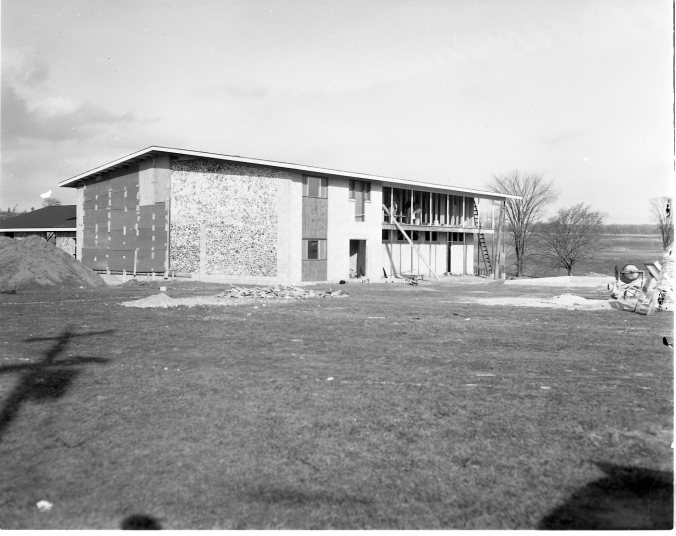 his large new clubhouse will provide excellent facilities for members and visitors at Brooklea Golf and Country Club on Highway 27, south of Midland, next summer. There is also a swimming pool just out of the picture to the right.