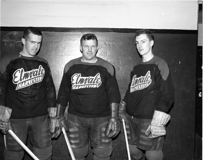 Elmvale Harvesters will be gunning for another Central Ontario group OHA intermediate “C” victory at Arena Gardens here tonight when they take on Stayner. Three of the black-shirted Elmvale stalwarts are, left to right, Ron McAuley, Bob Stacey and John Cole. Stacey is a defenceman and the other two lads are forwards.